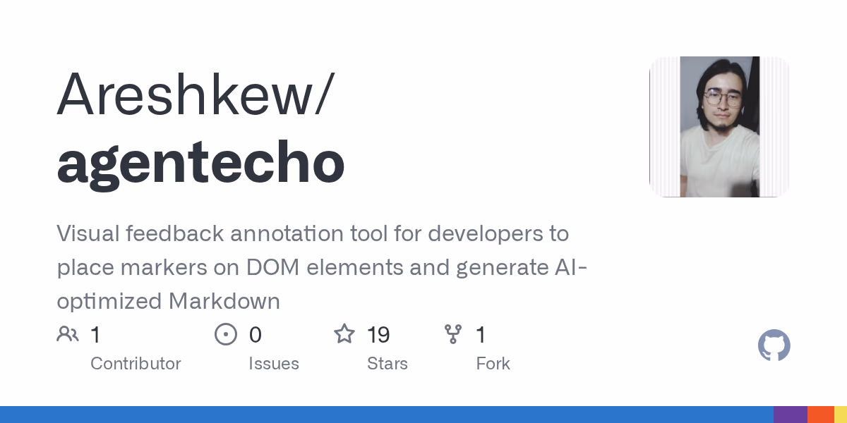Click to view full sizeAgentEcho is a visual feedback annotation tool designed for developers, allowing them to place markers on DOM elements and generate AI-optimized Markdown reports. This tool is particularly useful in scenarios like code reviews, bug reporting, and when providing input for AI coding assistants. AgentEcho supports framework detection, automatically identifying elements from React and Angular, with plans to expand support to Vue and Svelte. The tool generates unique and stable CSS selectors and includes essential information like classes, IDs, and text content for precise feedback documentation. Users can export their feedback as structured Markdown to facilitate efficient communication with AI agents. Installation is available via the Chrome Web Store or by building from source. AgentEcho emphasizes ease of use with features such as keyboard shortcuts, persistent feedback, and a developer-friendly design. The tool is not suited for commercial distribution under its current noncommercial license terms.