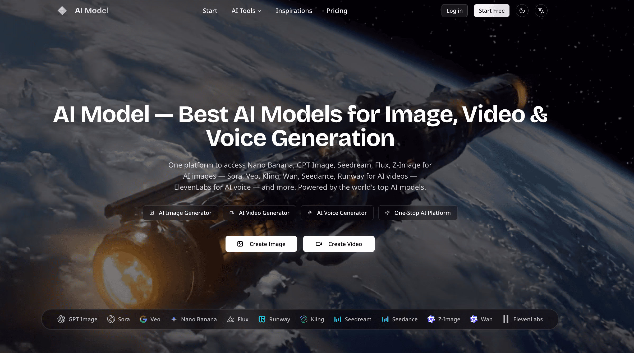 Click to view full sizeAI Model is a web platform that provides access to multiple AI generators in one place. It supports AI image creation from text prompts and image-to-image transformations, including style changes and background or composition edits. For video, it offers text-to-video generation, image-to-video animation, and video editing driven by text instructions. It also includes text-to-speech voice generation using ElevenLabs, with options for expressive speech and multi-speaker dialogue. The site highlights model switching so users can pick different engines depending on needs such as character consistency, typography in images, or cinematic motion in video. Outputs are presented as downloadable files and the interface includes prompt entry, model selection, settings, history, and a gallery of creations with prompts.