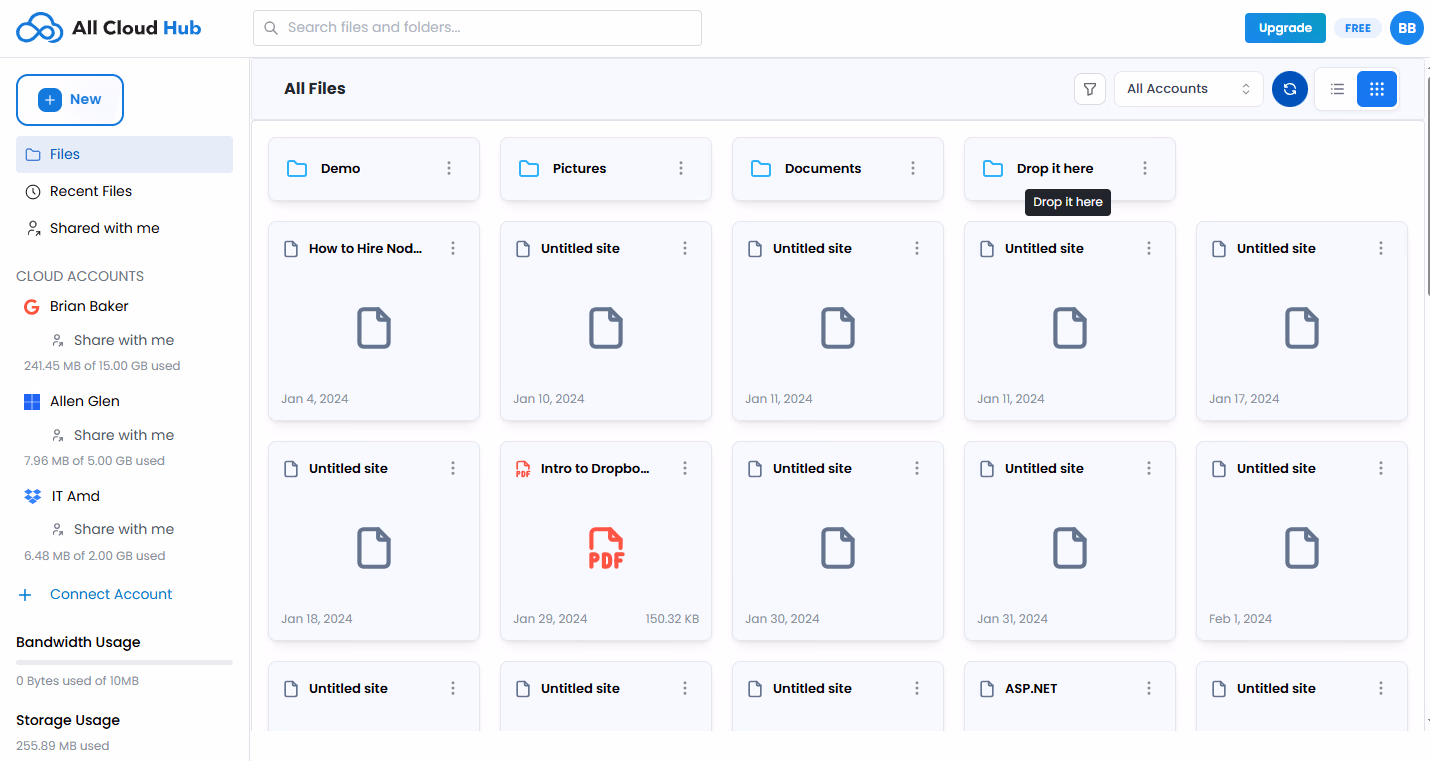 Click to view full size- All Cloud Hub is your trusted online cloud storage manager that consolidates Google Drive, Google Photos, OneDrive, Dropbox, and pCloud into a single powerful dashboard. - Unlock seamless cloud-to-cloud transfers, smart search across all connected accounts, automatic folder sync, and intuitive drag-and-drop file management. - Forget downloads and constant tab switching and enjoy unified file management secured by OAuth 2.0. - We never store your files and complete control always stays with you. Begin free with up to 3 cloud storage accounts or upgrade to unlock unlimited storage connections, faster transfers, and priority support.