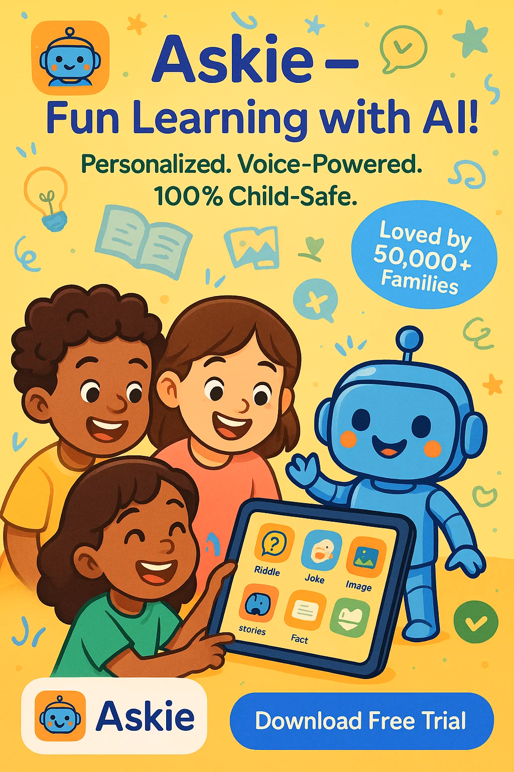 Askie: Safe AI for kids 4-15. Natural voice chat, AI art. Complete parental controls, conversation transcripts & content filtering. No ads, just fun.