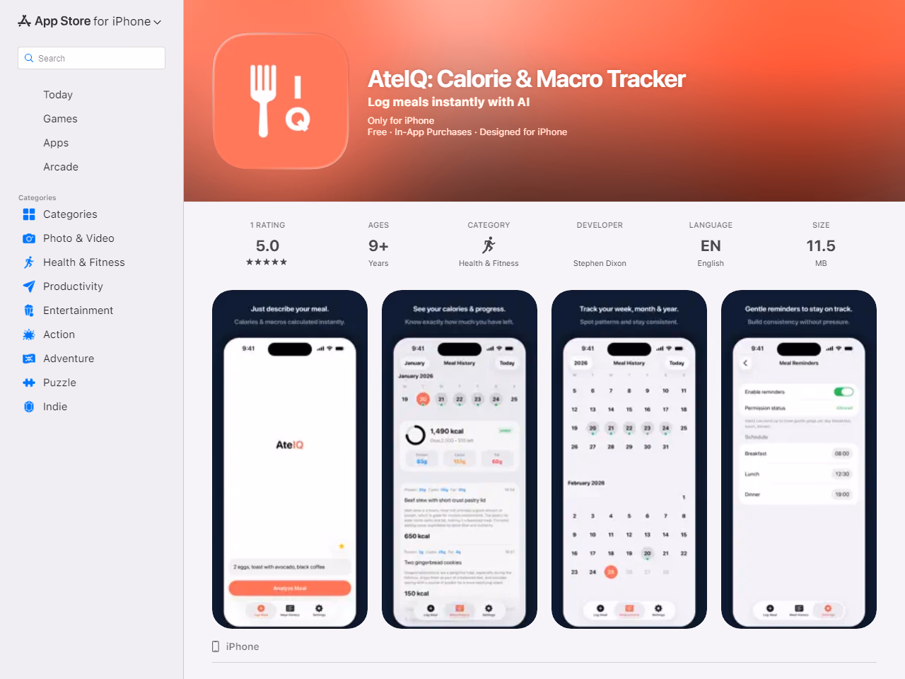 Click to view full sizeAteIQ is an AI-powered calorie tracker app designed for iPhone users. It simplifies nutrition tracking by allowing users to describe their meals in plain English, instantly providing calorie and macro breakdowns without the need for manual entry or scanning. The app features smart reminders to help users stay consistent with logging meals and setting personalized calorie goals to support dietary plans. Additional functionalities include the ability to edit and reanalyze past meals, set meal favorites, and view historical meal data. AteIQ integrates with Apple Health via HealthKit, allowing Pro users to sync calorie data. The app offers in-app purchases for enhanced features, including unlimited logs and richer insights. Designed for ease of use, AteIQ includes a guided onboarding process, custom meal reminders, and supports fitness goals through protein tracking. The app is categorized under Health & Fitness and is compatible with various Apple devices, enforcing a privacy policy that ensures user data is not linked to personal identity unless explicit permission is granted. It supports users in achieving a more informed and consistent approach to nutrition tracking.