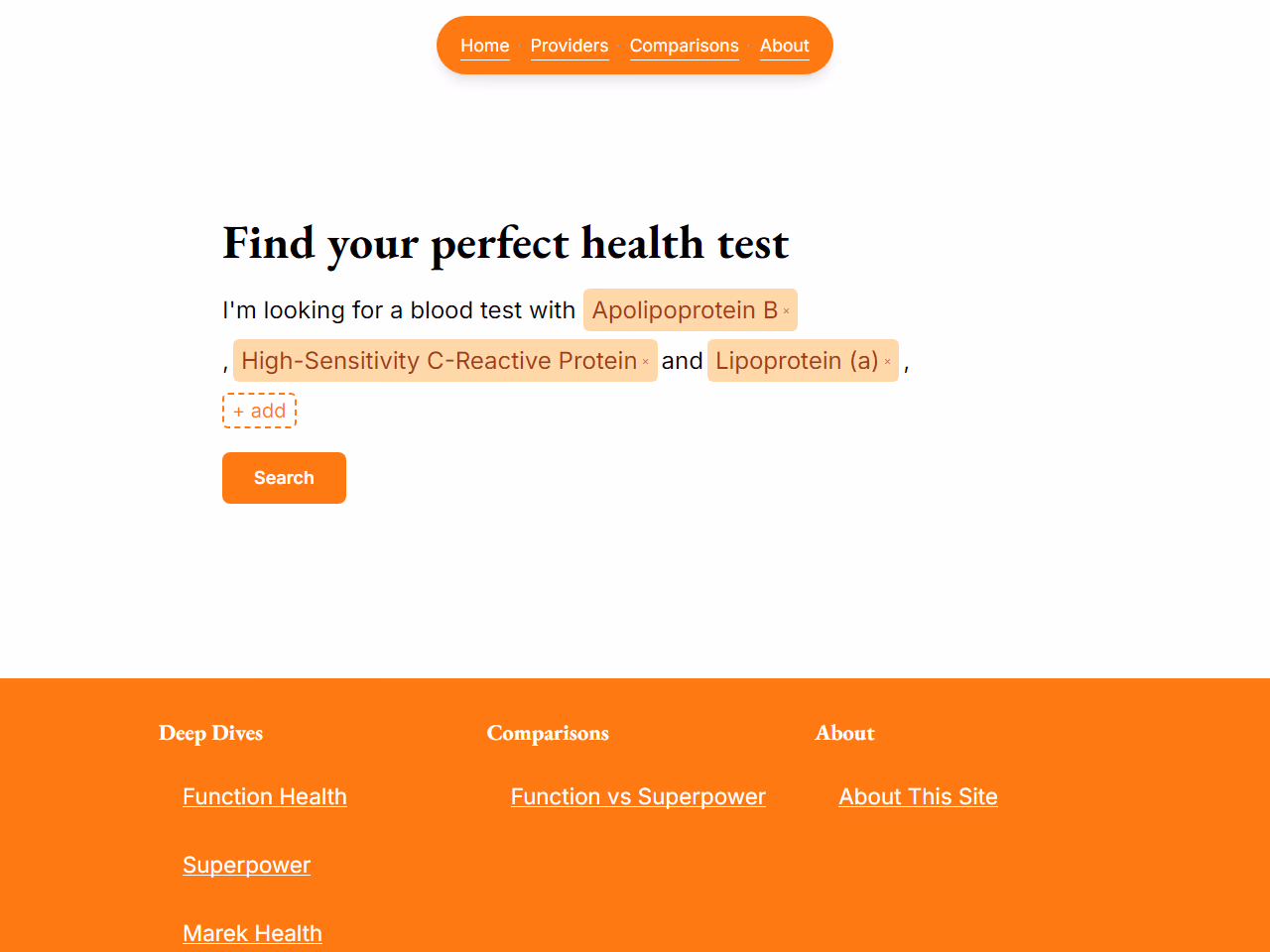 Click to view full sizeThe tool is designed to help users compare blood test packages from leading healthcare providers. It offers a platform where individuals can search for specific blood tests, such as Apolipoprotein B, High-Sensitivity C-Reactive Protein, and Lipoprotein (a), and evaluate different options. The site includes sections for detailed comparisons and reviews of various providers like Function Health, Superpower, Marek Health, and InsideTracker. This enables users to make informed decisions by analyzing specific test components and the services offered by each provider. Overall, it aims to enhance user access to tailored health tests.