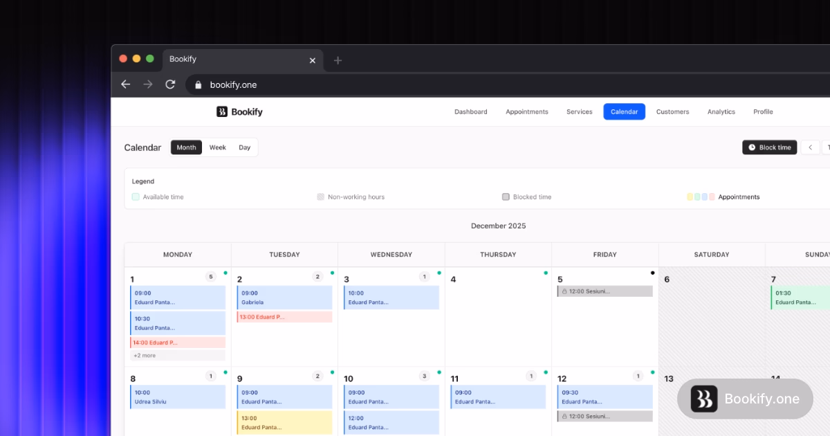 Online booking with smart calendar, reminders, and analytics to manage appointments.