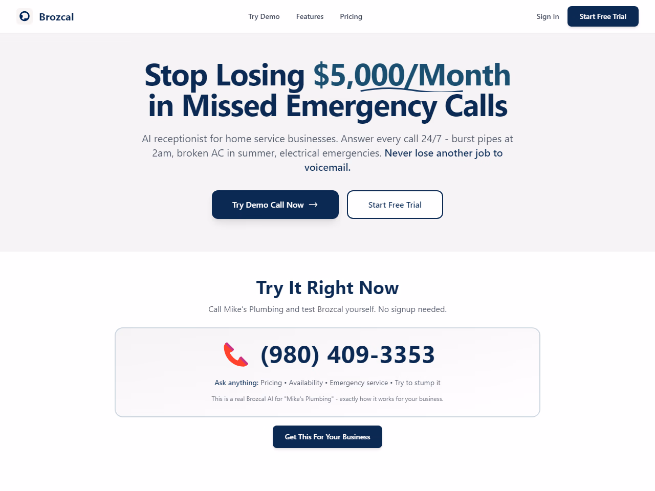 Click to view full sizeBrozcal is an AI-driven virtual receptionist designed specifically for home service businesses such as plumbing, HVAC, electrical, and more. Its main function is to ensure that businesses no longer miss important calls, particularly emergency ones, by providing 24/7 call answering services. When a customer makes a call, Brozcal captures essential details including the customer's name, phone number, address, and issue urgency. In emergency situations, it sends an instant text and transfers the call to the business owner. For routine inquiries, it gathers information for a later callback. This tool claims to transform missed calls into captured opportunities, effectively turning potential losses into business gains by preventing revenue loss from missed job opportunities. Brozcal offers fast setup and does not require complex configurations, making it a suitable solution for businesses of all sizes, including one-person operations.
