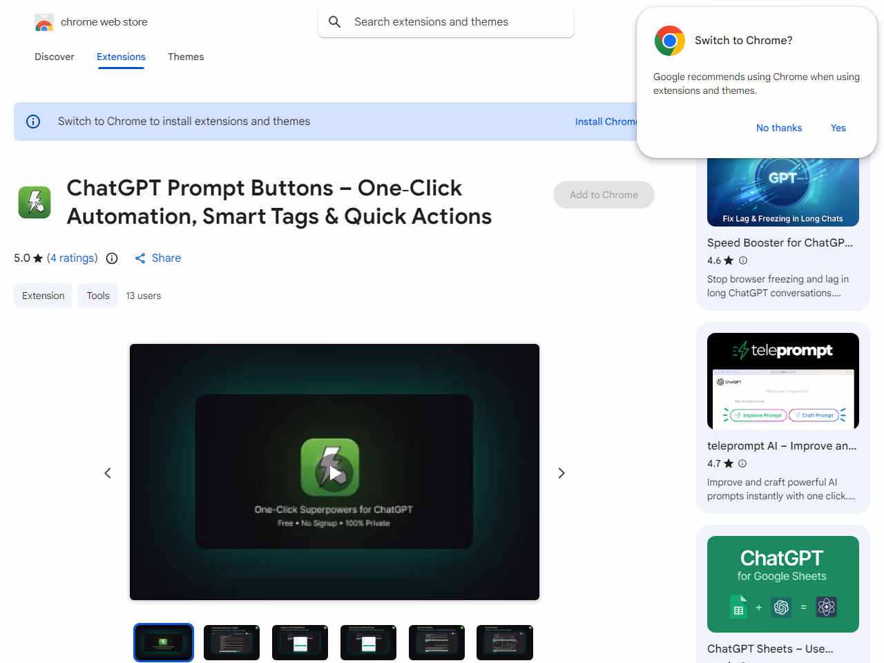 Click to view full sizeThe "ChatGPT Prompt Buttons" extension for Chrome enhances the functionality of ChatGPT by introducing one-click action buttons that facilitate instant content modifications. Users can leverage smart, customizable tags to easily execute tasks such as summarizing, rewriting, expanding, and formatting text without manual prompt reentry. This tool is ideal for various professionals, including students, writers, marketers, and researchers, enabling them to streamline workflows and enhance productivity. Key features include predefined actions like summarizing or converting text into bullet points and the ability to create unlimited custom actions, such as translating or optimizing for SEO. The extension operates entirely locally, ensuring user privacy and no external data transmission, making it a lightweight yet powerful addition to ChatGPT that prioritizes ease of use and speed over complexity.