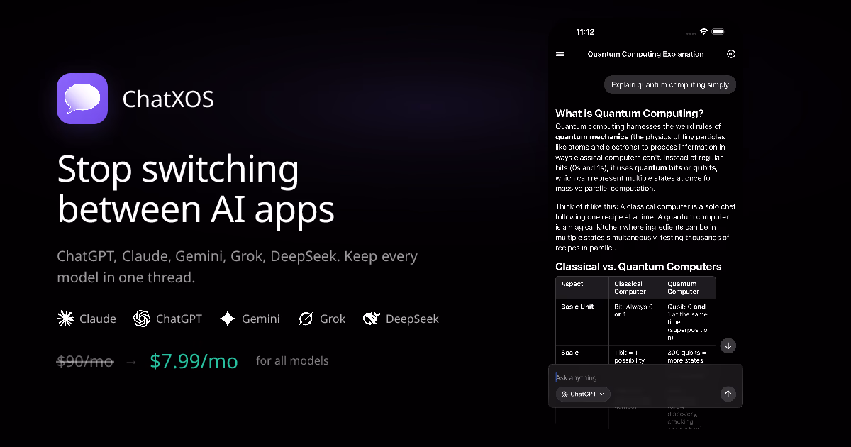 Click to view full sizeChatXOS is an all-in-one AI chat application designed for iPhone users who frequently work with multiple AI models. It combines five popular AI tools—ChatGPT, Claude, Gemini, Grok, and DeepSeek—into a single app, providing seamless, mid-conversation switching between models. The app offers a unified chat history, allowing users to keep all conversations in one place, ensuring context is never lost. ChatXOS is particularly suited for developers, writers, students, founders, and AI power users who require diverse AI functionalities without managing multiple subscriptions. Priced at $12.99 per month, it offers unlimited messaging and is significantly cheaper than subscribing to each AI service individually, which collectively can cost around $90 per month. The app is designed to be mobile-first, promising fast, ad-free, and user-friendly performance on iOS devices. Future plans include extending support to Android, making it accessible to a wider audience.