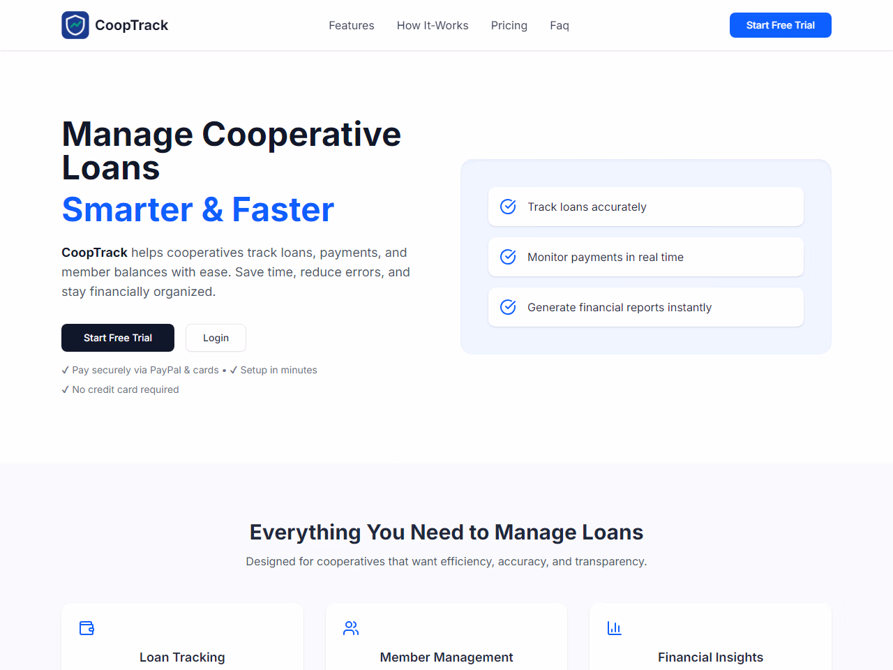 Click to view full sizeCoopTrack finance-fintech, startup-small-business, saas-tools Simplifying loan management for cooperatives. Manual loan tracking causes errors and wastes time for cooperatives. CoopTrack centralizes loan and payment tracking in one simple, accurate system. Cooperatives, Credit unions, Loan officers, Treasurers Loan Tracking & Monitoring, Payment Collection & Recording Real-time Loan Tracking, Automated balance updates, Payment history tracking, Financial insights & reports