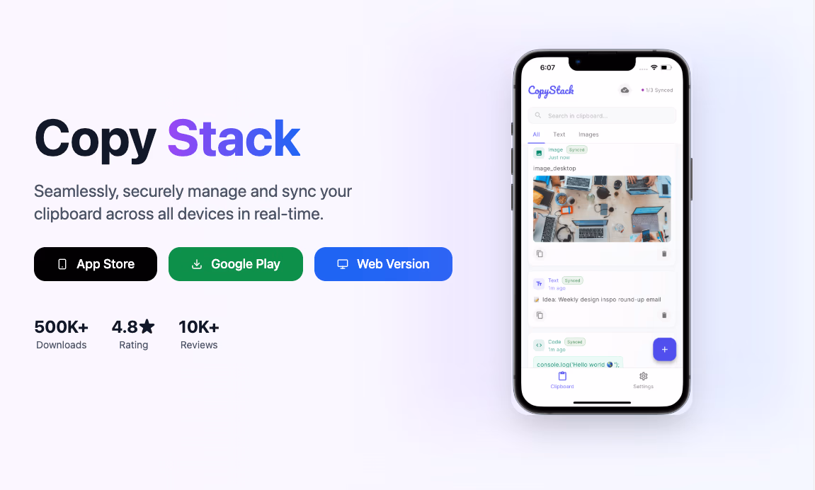 Click to view full sizeCopy Stack is a multi-device clipboard management tool designed to seamlessly and securely sync clipboard data across various devices in real-time. With its robust functionality, users can manage their clipboard history, ensuring easy access to past content via an intuitive interface. The service emphasizes security by providing encrypted synchronization, ideal for storing sensitive information like code snippets and passwords. Copy Stack is accessible on multiple platforms including iOS, Android, and the web, offering flexibility and connectivity. The application supports multi-device management through a unified dashboard, allowing users to control their syncing preferences. Whether using a free or premium plan, users can enjoy features like unlimited storage, ad-free experiences, and priority support, enhancing productivity and workflow efficiency. This tool is highly rated and trusted by content creators, developers, and professional users for improving their productivity and managing their digital workflow effectively.