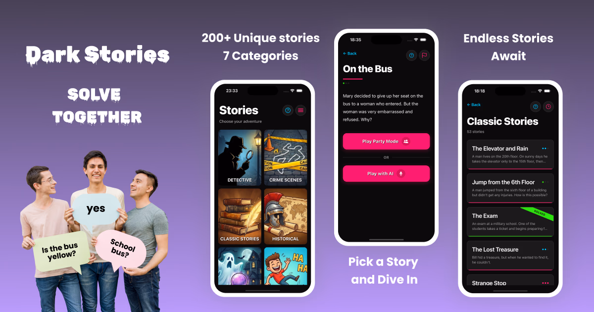 App offers 200+ riddles with yes/no Q&A, AI solo and group party modes.
