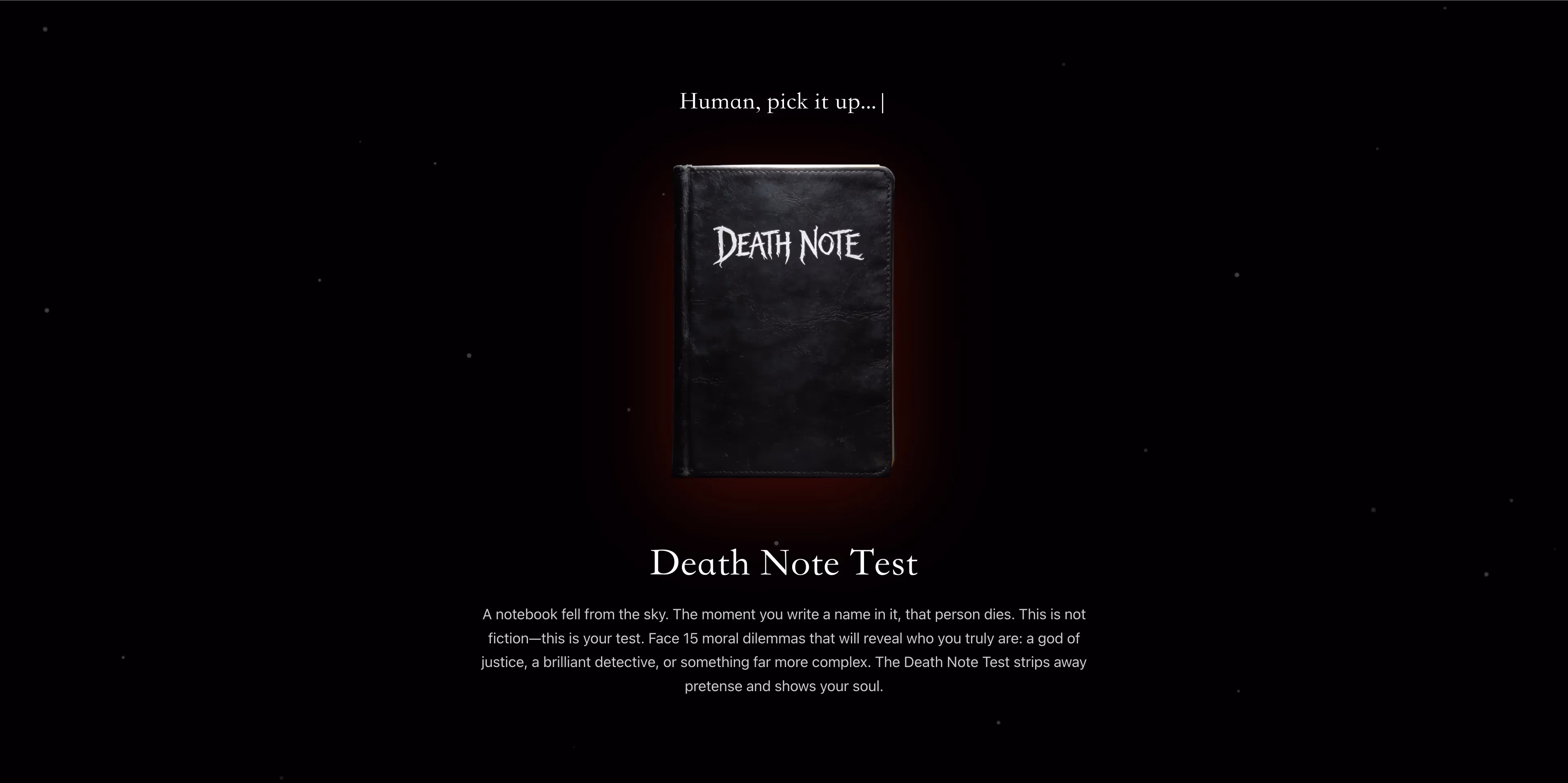 Click to view full sizeThe Death Note Test is a personality quiz designed to match users with one of five iconic characters from the anime series "Death Note"—Light Yagami, L Lawliet, Misa Amane, Near, or Ryuk. The test involves answering 15 moral dilemmas that delve into users' approaches to justice, logic, empathy, and ambition, thus revealing which character aligns with their personality and philosophical outlook. This tool seeks to provide insights into one's moral compass by analyzing choices across five dimensions: Justice, Logic, Cruelty, Social, and Ambition. Although it is primarily for entertainment, users often find the results reflective of their decision-making styles and moral philosophies. The test is free to take, requires no registration, and can be repeated to see how one's choices may evolve over time.