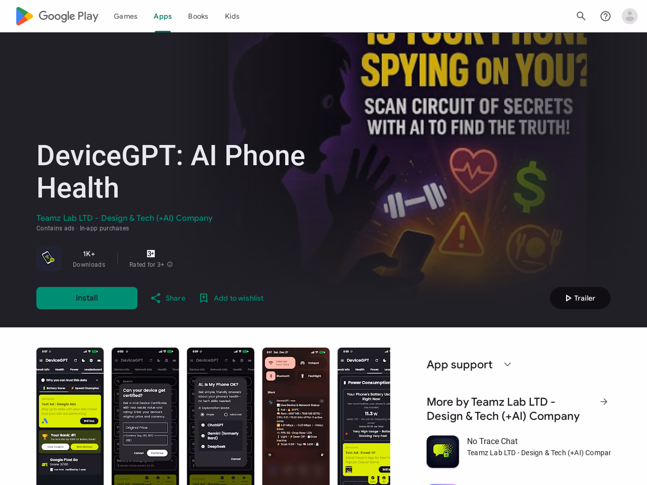 Click to view full sizeDeviceGPT: AI Phone Health, developed by Teamz Lab LTD, is an AI-powered application designed for Android devices to monitor and improve phone health. The app offers comprehensive diagnostic tools that assess battery performance, privacy, network stability, and overall device health. Users can receive AI-generated explanations and recommendations by sharing diagnostic data with AI assistants like ChatGPT. The app includes features such as privacy scanning, CPU and RAM usage monitoring, and network diagnostics, along with power consumption insights for efficient battery use. Device performance can be tracked on a global leaderboard, enabling users to compare and optimize their devices. Privacy-conscious users and tech enthusiasts can benefit from optional anonymity features and detailed device reports for resale or personal use.