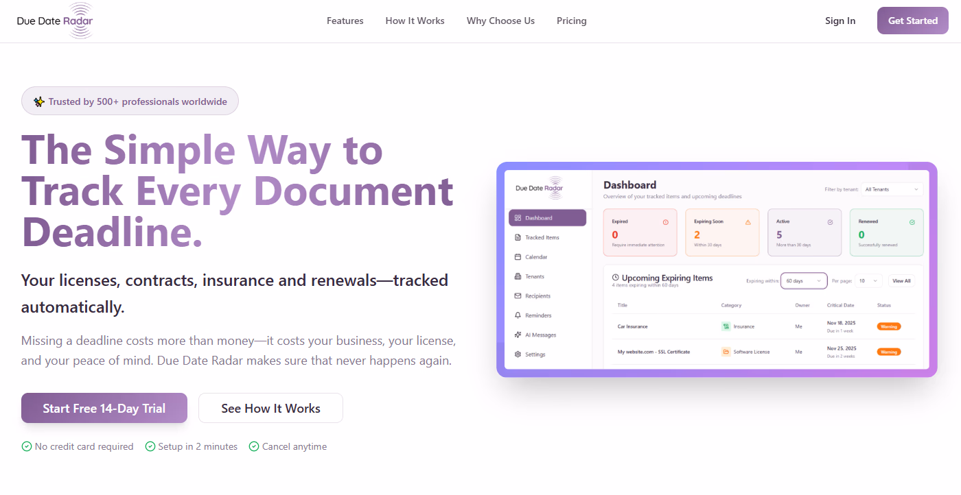 Click to view full sizeDue Date Radar is a specialized tool designed to help professionals track and manage document deadlines efficiently. It targets users who need to keep track of licenses, contracts, insurance renewals, and other critical documents, preventing costly penalties and business disruptions caused by missed deadlines. The tool provides users with a color-coded dashboard for instant visibility of approaching expirations, automated email and SMS reminders, and an AI-powered message generator for professional communications. It ensures high-level security with SOC 2 compliance and 256-bit encryption. Due Date Radar supports multiple businesses or locations under one account and offers customization options for reminder intervals. The platform is ideal for industries such as healthcare, construction, legal, and small businesses, serving over 500 professionals and helping avert penalties upwards of $2.4 million. With three pricing tiers—Starter, Professional, and Enterprise—it caters to different business sizes, all with a quick setup, free trial, and no long-term commitments.