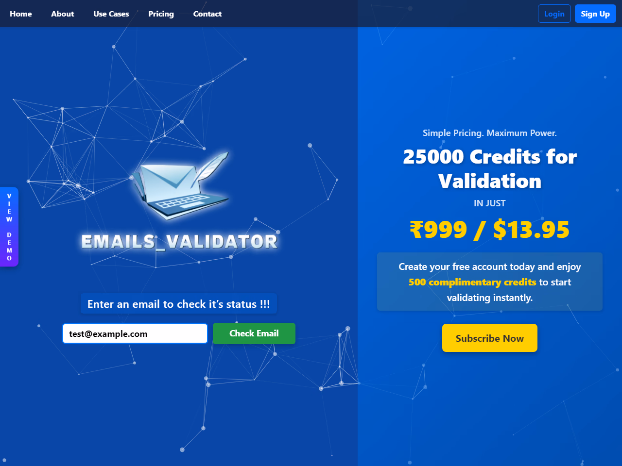 Click to view full sizeEmails_Validator is an email validation service that offers a reliable and efficient way to verify email addresses for various industries. It is powered by IM-ProfessionalSS, a trusted consultancy firm. The platform ensures users maintain clean and verified email lists, reducing bounce rates and enhancing communication accuracy. Key features include high accuracy, secure platform, and simplicity of use, allowing users to download valid and invalid email lists easily. The service caters to digital marketers, startups, HR teams, e-commerce businesses, educational institutions, and government entities. Pricing is transparent, offering affordable options with different validation credits to meet varied needs, including a free signup offer with 500 initial credits. The service is designed to provide practical, reliable solutions for maintaining accurate communication channels.