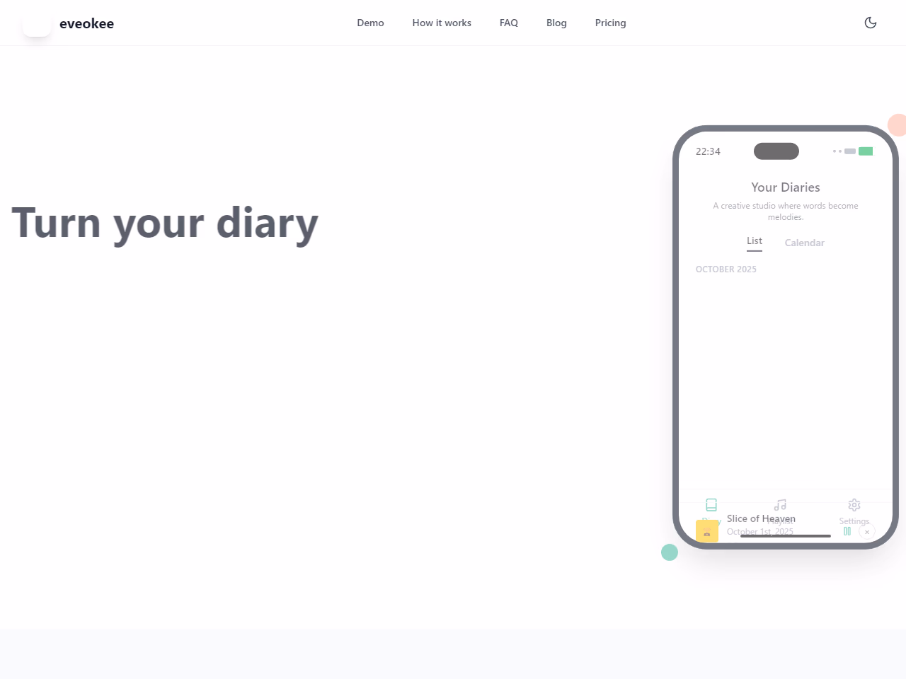 Click to view full sizeEveokee is a unique digital journaling tool that transforms written diary entries into music. Aimed at providing a novel way for users to express their thoughts and emotions, Eveokee offers a creative studio where written words become melodious tracks. The app is available on iOS and is in beta testing for Android, requiring users to sign up for early access. Eveokee encourages users to engage with their personal stories sonically, offering a playlist feature where they can listen to musical interpretations of their diaries. This innovative approach aims to make journaling more engaging and enjoyable, turning routine entries into personal soundtracks. User testimonials highlight the app's ability to capture feelings and make journaling a playful, repeatable experience. Privacy and data security are emphasized, and potential users can stay informed about app updates through notifications.