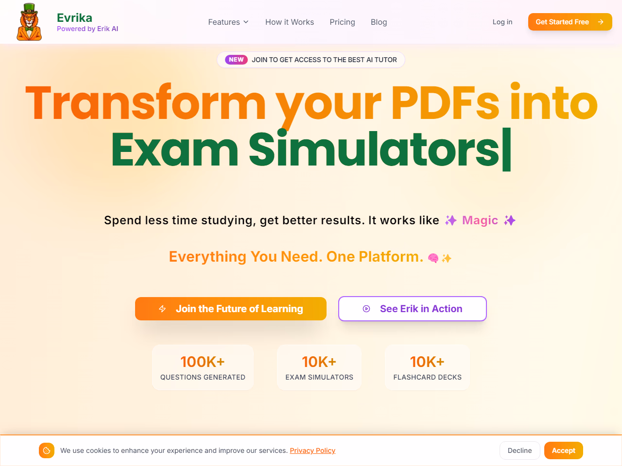Click to view full sizeEvrika is an AI-powered exam preparation platform designed to enhance the way students study and prepare for exams. It employs advanced AI technology, called Erik AI, to create individualized study plans, interactive practice tests, smart flashcards, and comprehensive cheat sheets, all tailored to a student's specific learning style and pace. By using a combination of spaced repetition techniques and personalized learning paths, Evrika helps students engage with material more efficiently. The platform allows users to upload a variety of study materials, which the AI analyzes to generate a complete suite of study resources. Its capabilities extend beyond static content generation to provide intelligent hints, explanations, and feedback. These features make Evrika a comprehensive tool for students aiming to master subjects more effectively, offering both free and premium subscription options depending on the user's needs.