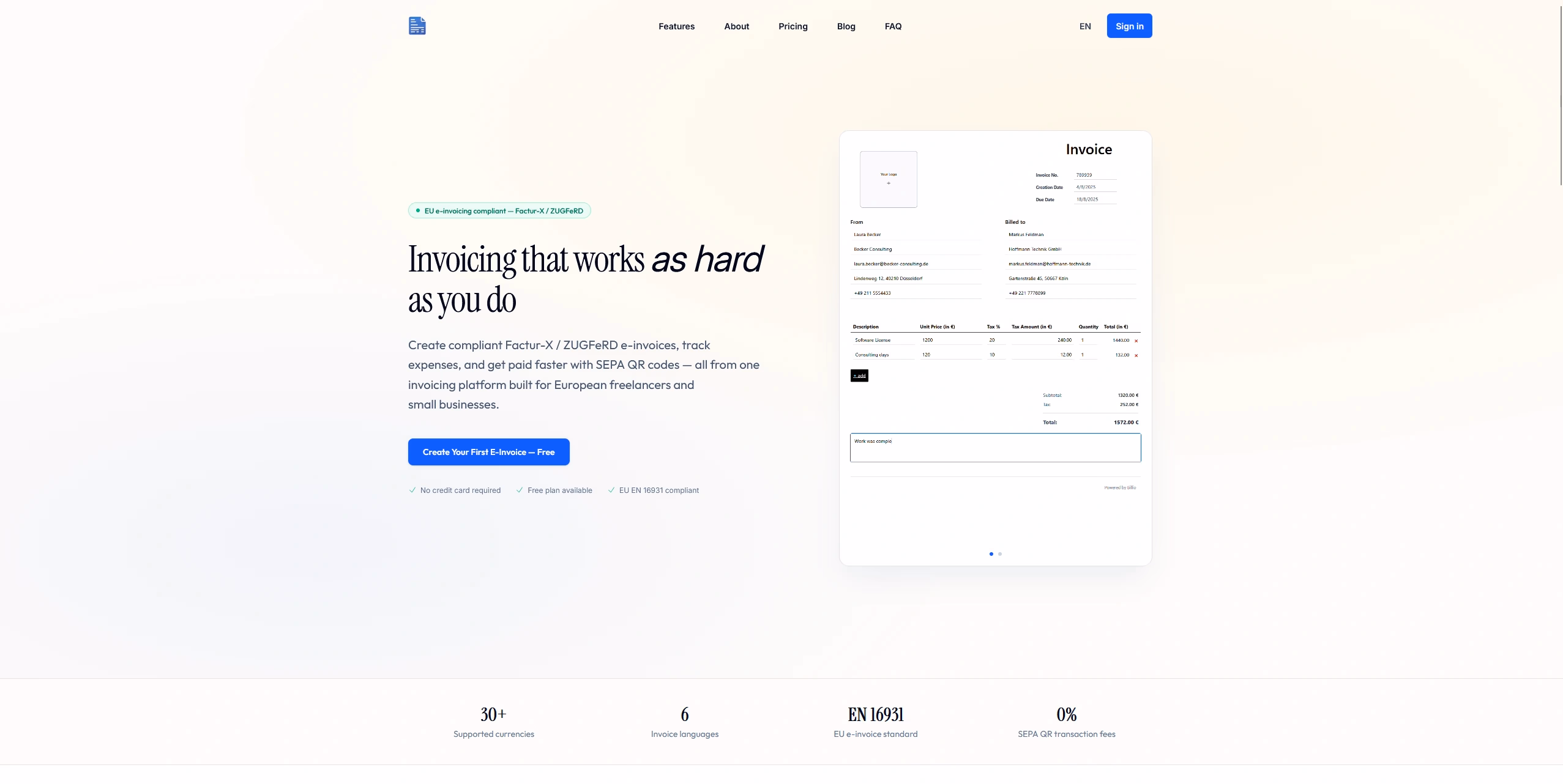 Factur-X & ZUGFeRD e-invoicing for European freelancers.
