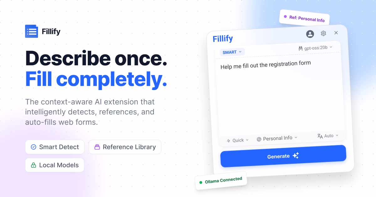 Click to view full sizeFillify is an AI-powered browser extension designed to streamline the process of filling out online forms, composing emails, and generating detailed bug reports. It uses advanced AI models to intelligently detect and autofill form fields with high accuracy, thereby saving users significant time on repetitive tasks. Fillify offers several modes, including a 'Smart Mode' for automatic detection and specialized modes for specific tasks like email and bug reports. It supports multiple AI providers and local models for increased flexibility and privacy. Notably, all user data remains secure as API keys and form data are stored locally in the browser without being sent to servers. The tool also includes features such as a personal information library for reusable templates and global translation capabilities. Suitable for various types of forms, Fillify ensures seamless automation and enhanced user privacy.