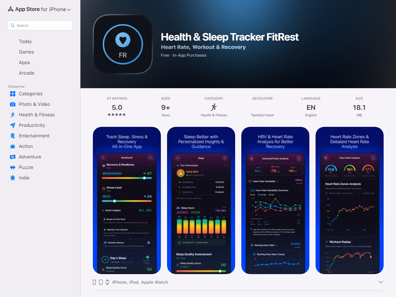 Click to view full sizeFitRest is a comprehensive health and fitness tracking app tailored for iOS devices. It integrates seamlessly with Apple Health and other health platforms, enabling users to track sleep quality, monitor heart rate variability (HRV), and manage stress levels. The app offers detailed insights into individual health metrics, such as sleep stages, hydration levels, and blood oxygen levels during sleep. It supports a wide range of devices, including Apple Watch, Fitbit, Garmin, and Oura Ring, enhancing its utility in providing a holistic view of users' wellness. FitRest transforms health data into actionable insights, helping users optimize their well-being through personalized recommendations. It features an intuitive interface with various widgets for quick health logging and real-time monitoring, making it ideal for fitness enthusiasts and health-conscious individuals. The app also supports motivational tools such as achievements and personalized goal tracking. User privacy is prioritized, ensuring a secure and ad-free experience.