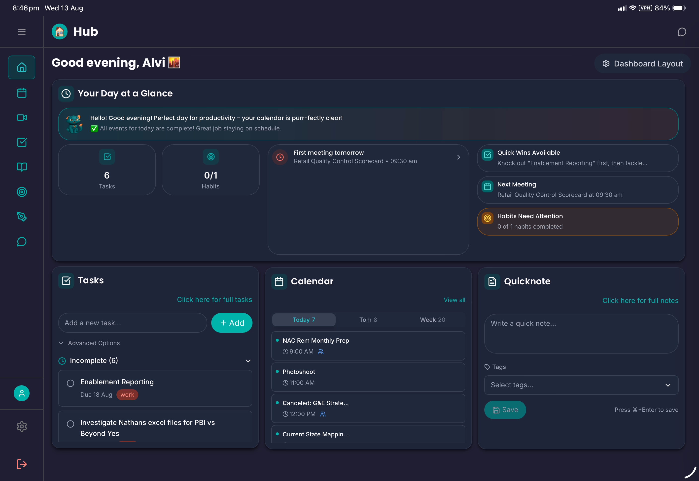 Click to view full sizeFloHub is a comprehensive productivity application designed to streamline task management, note-taking, habit tracking, and journaling, providing users with a single, unified daily dashboard. The platform aims to eliminate the need for switching between multiple productivity tools by integrating essential functions into one interface, promoting a calmer and more focused daily routine. FloCat, the AI companion, assists by subtly guiding the user’s decisions throughout the day. FloHub is privacy-focused, ensuring that user data remains secure and private, with encryption and no data sales involved. The app is available for free on the web, with premium features and enhanced device integration offered through native apps. With its user-friendly design and emphasis on reducing mental load, FloHub appeals to individuals seeking simplicity and efficiency in managing their daily schedules.