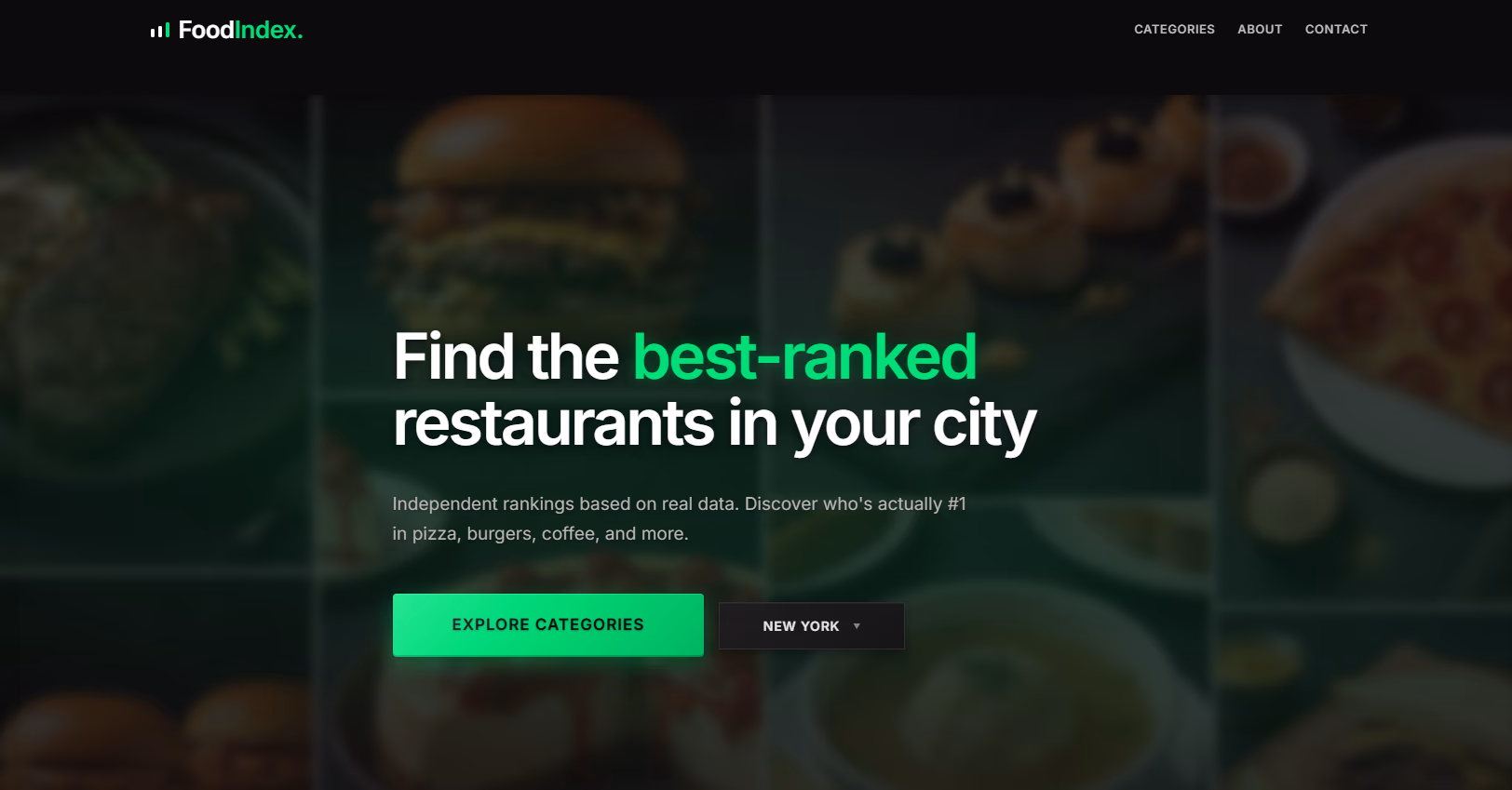 Click to view full sizeFoodIndex is a restaurant ranking website that helps users discover the best-ranked places to eat in their city using aggregated review and delivery-platform data. The site presents “independent food rankings” and emphasizes that its lists are based on real data rather than editorial picks. It highlights New York as available now, with Los Angeles also available and Chicago marked as coming soon. Users can explore categories such as pizza, burgers, coffee, and more to see who is ranked #1. FoodIndex also offers a weekly rankings email subscription to keep visitors updated on the latest changes in restaurant standings, with clear privacy and unsubscribe messaging. The site includes standard pages like About, Contact, and legal policies.
