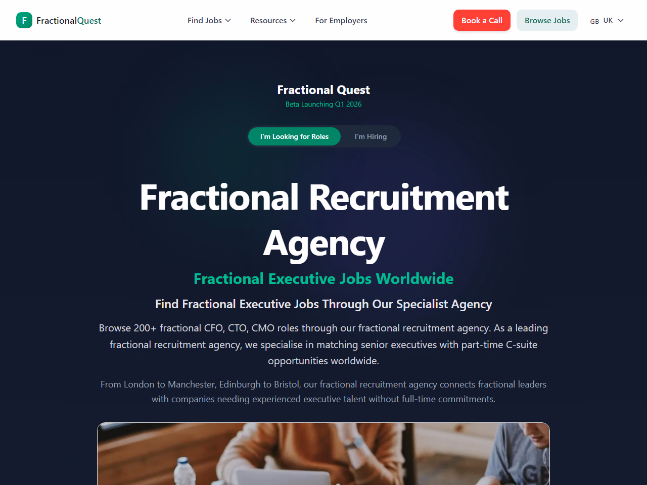 Click to view full sizeFractional Quest is a platform dedicated to connecting professionals with fractional executive job opportunities in the UK. The site specializes in roles such as CFO, CTO, CMO, COO, and CISO, providing an AI-powered search function to streamline the process of finding suitable positions. With over 200 live opportunities available, the platform caters to various work types, including fractional, interim, part-time, and advisory jobs, across major UK locations like London, Manchester, and Edinburgh, as well as remote positions. Fractional Quest also offers resources such as salary guides, a rate calculator, and a portfolio career guide to assist job seekers. Additionally, the platform supports employers in posting roles and conducting executive searches.