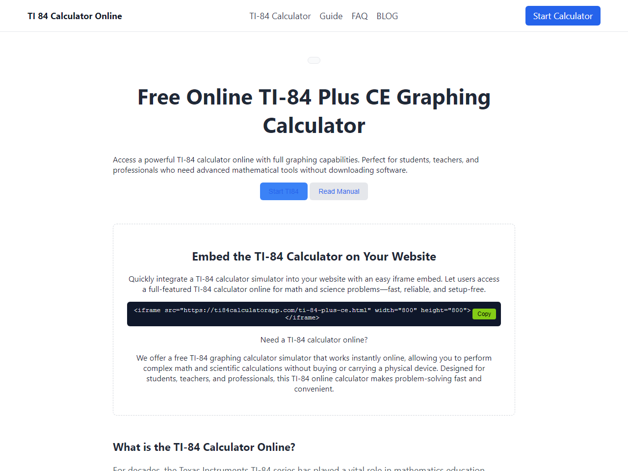 Click to view full sizeThe website offers a free, instant-access online simulator of the TI-84 Plus CE graphing calculator, designed for students, teachers, and professionals. This tool replicates the core functionalities of the physical TI-84, including advanced graphing, scientific calculations, and statistical analysis, all directly in your browser without any downloads or installations. It is compatible with modern web browsers on both desktop and mobile devices, ensuring convenient access to a full-featured graphing calculator anytime, anywhere. Additionally, users can embed the calculator on their websites using an iframe, making it a versatile option for education and professional needs. The platform prioritizes privacy by processing calculations locally in the user's browser, without sending data to external servers, providing a fast and secure experience. This tool is particularly useful for those who require the functionalities of a TI-84 calculator but do not have physical access or prefer a digital solution.
