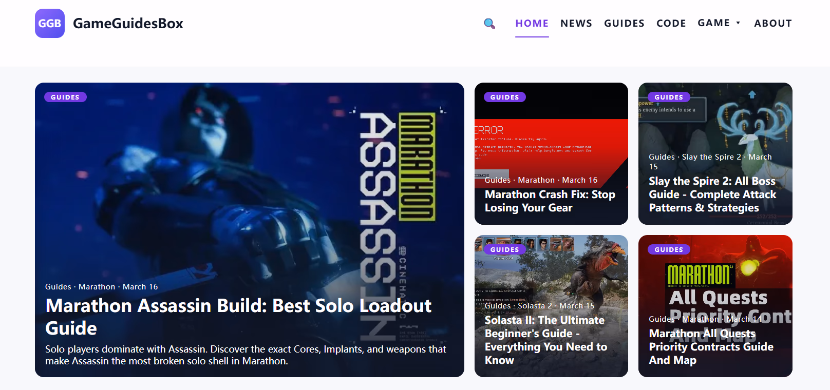 Click to view full sizeGameGuidesBox is a gaming content site that organizes game-related help into three main areas: News, Guides, and Code. The Guides section provides walkthroughs, boss and puzzle solutions, beginner tips, build and loadout recommendations, and game-specific “complete guide hub” pages (e.g., Marathon, Resident Evil 9 Requiem, Slay the Spire 2). It also includes troubleshooting posts such as crash-fix guides aimed at preventing progress or gear loss. The News section posts updates and commentary on game patches and releases. The Code section compiles redeemable code lists, with an example focused on Roblox codes for multiple experiences. Overall, the site helps players learn mechanics, complete objectives, and keep up with updates across AAA and indie titles.