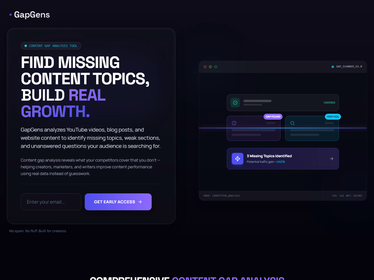 Click to view full sizeGapGens is a content gap analysis tool designed to enhance the performance of YouTube videos, blog posts, and website content by identifying missing topics and sections that audiences are searching for. It helps creators and marketers discover what competitors are covering that their content does not, allowing them to create more impactful content based on real data. With features like prioritized gap scoring and automated competitor analysis, GapGens streamlines the research process, enabling users to focus more on content creation than analysis. Built with a user-friendly design, it offers secure and private operations tailored for content creators, bloggers, and marketers seeking to improve their strategic approach using precise and reliable information.