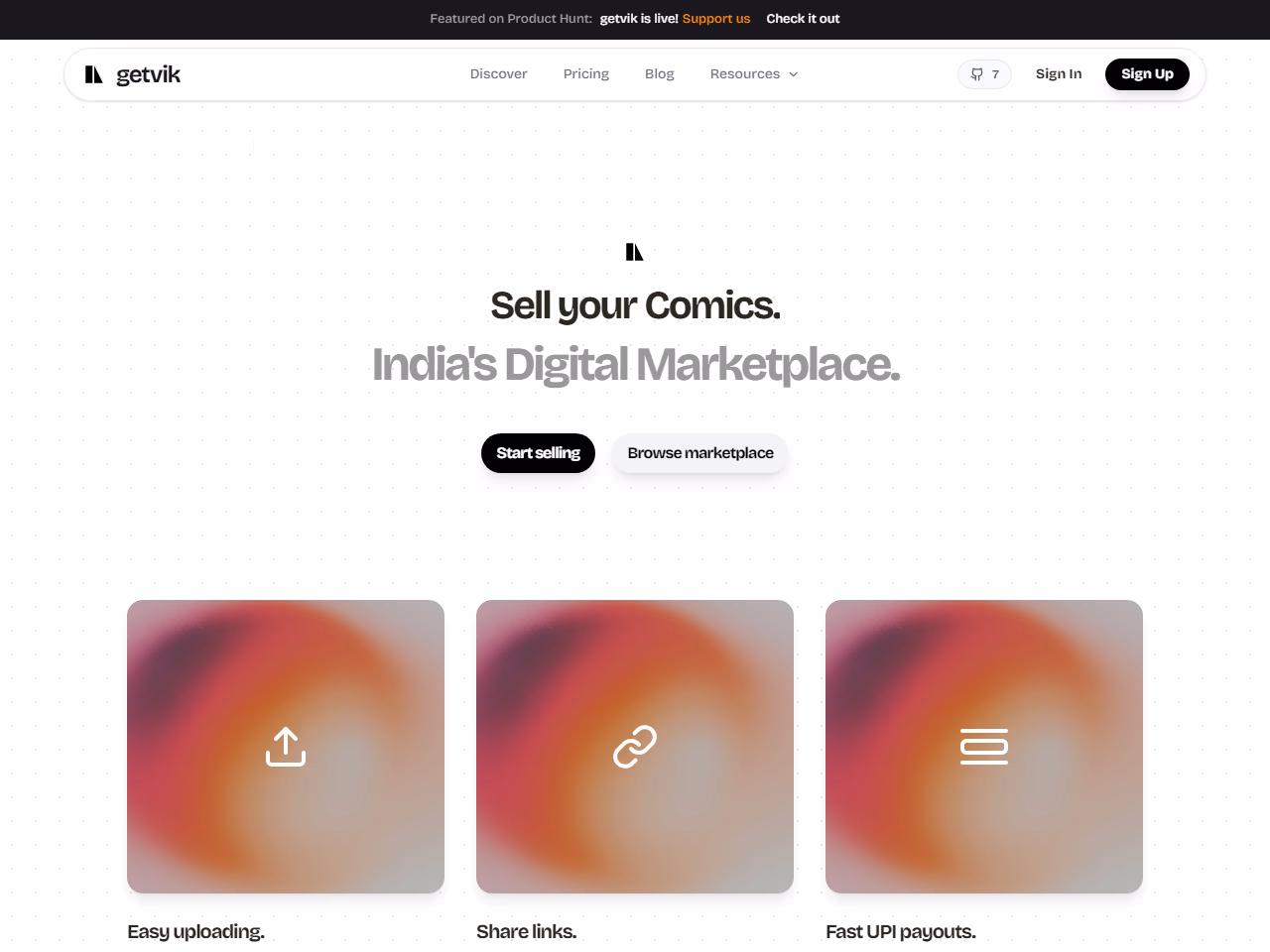 Click to view full sizeGetVik is a digital marketplace designed to empower creators in India by facilitating the sale of digital products such as Notion templates, eBooks, scripts, and audio files. The platform prioritizes ease of use with features like secure product hosting, instant digital delivery, and rapid payment processing via UPI, cards, and netbanking. With a focus on Indian creators, GetVik supports seamless INR transactions and promises low transaction fees without requiring technical skills or a personal website. Users can quickly upload content, share product links, and manage sales from a straightforward dashboard. Aiming to streamline the monetization process, GetVik enables creators to focus on their work while handling the complexities of sales and distribution.