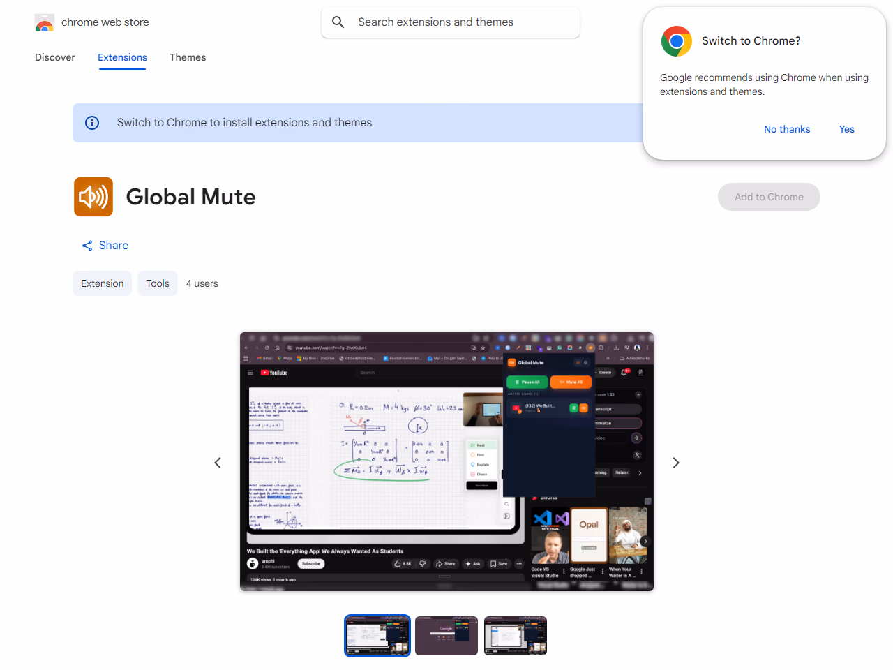 Click to view full sizeGlobal Mute is a Chrome extension designed to manage and control audio across multiple browser tabs from a centralized dashboard. It solves the common problem of identifying which tabs are playing audio by providing a streamlined list that displays all audio-active tabs. Users can mute, pause, or navigate directly to these tabs with ease. Key features include an option to silence all tabs at once, real-time detection of new audio sources, and visual audio indicators for easy recognition. The extension prioritizes privacy by ensuring that no data leaves the user's browser and requires minimal permissions to operate. This tool benefits multitaskers, remote workers, and music enthusiasts who frequently deal with multiple tabs. Global Mute boasts a modern design with dark mode support, enhancing both functionality and user experience. It is available for free, with no ads or upsells, making it an efficient solution for anyone looking to manage browser audio seamlessly.