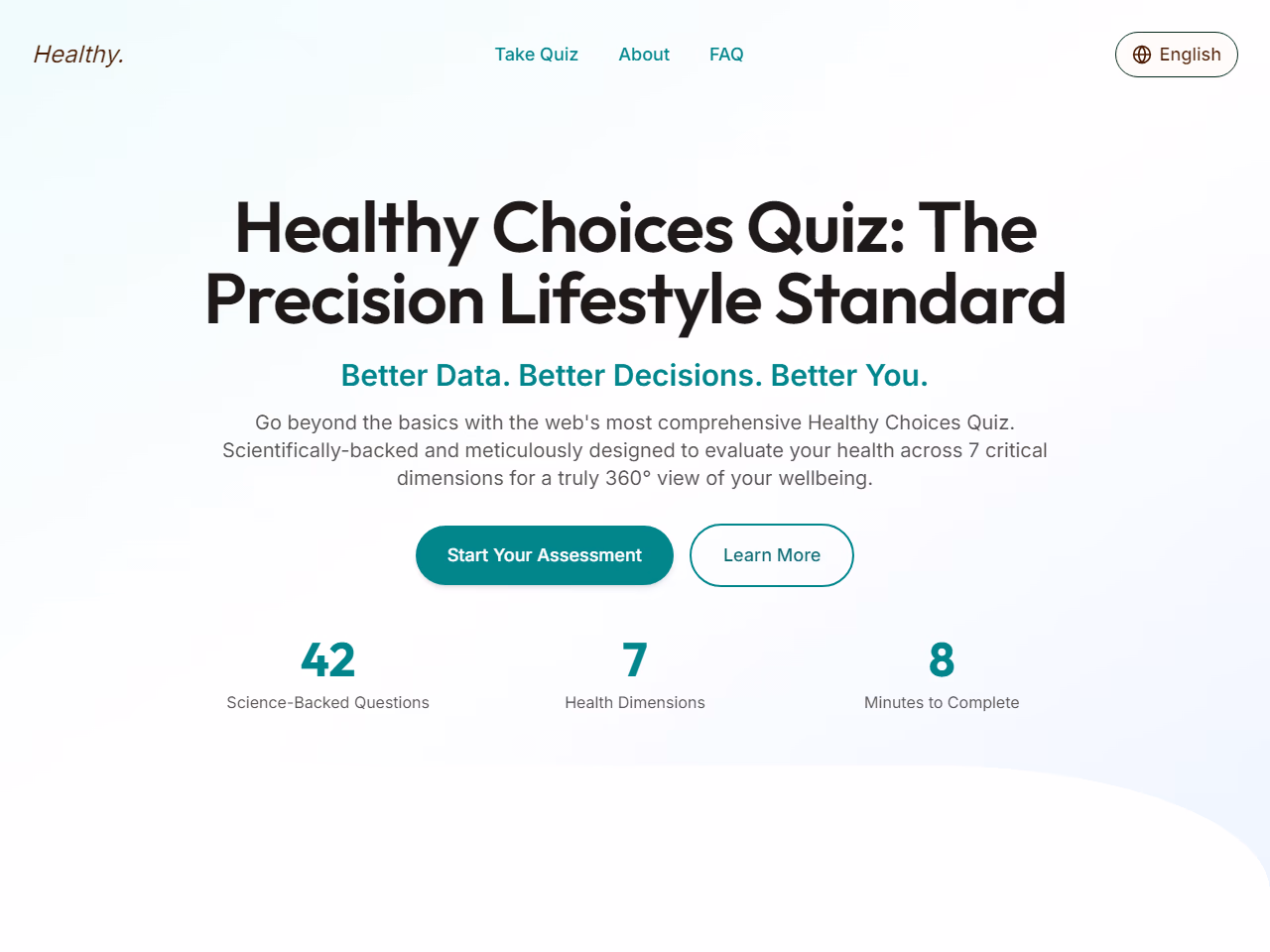 Click to view full sizeThe Healthy Choices Quiz is a comprehensive, science-backed online assessment designed to evaluate your lifestyle across seven critical health dimensions: nutrition, physical activity, sleep, mental resilience, substance use, environmental factors, and biological indicators. Consisting of 42 questions, this tool provides a 360° view of your wellbeing in approximately eight minutes. It extends beyond standard health questionnaires by addressing modern health risks such as ultra-processed foods, digital fatigue, and circadian rhythm disruption. Users receive instant insights backed by peer-reviewed research and personalized 24-hour challenges to promote actionable lifestyle changes. The quiz offers a total health score with a detailed breakdown across all dimensions, visualized through a radar chart. Available for free without signup requirements, it prioritizes user privacy by storing data locally within the browser. This educational tool is not intended as a substitute for professional medical advice, but rather aims to enhance awareness and encourage healthier lifestyle decisions.