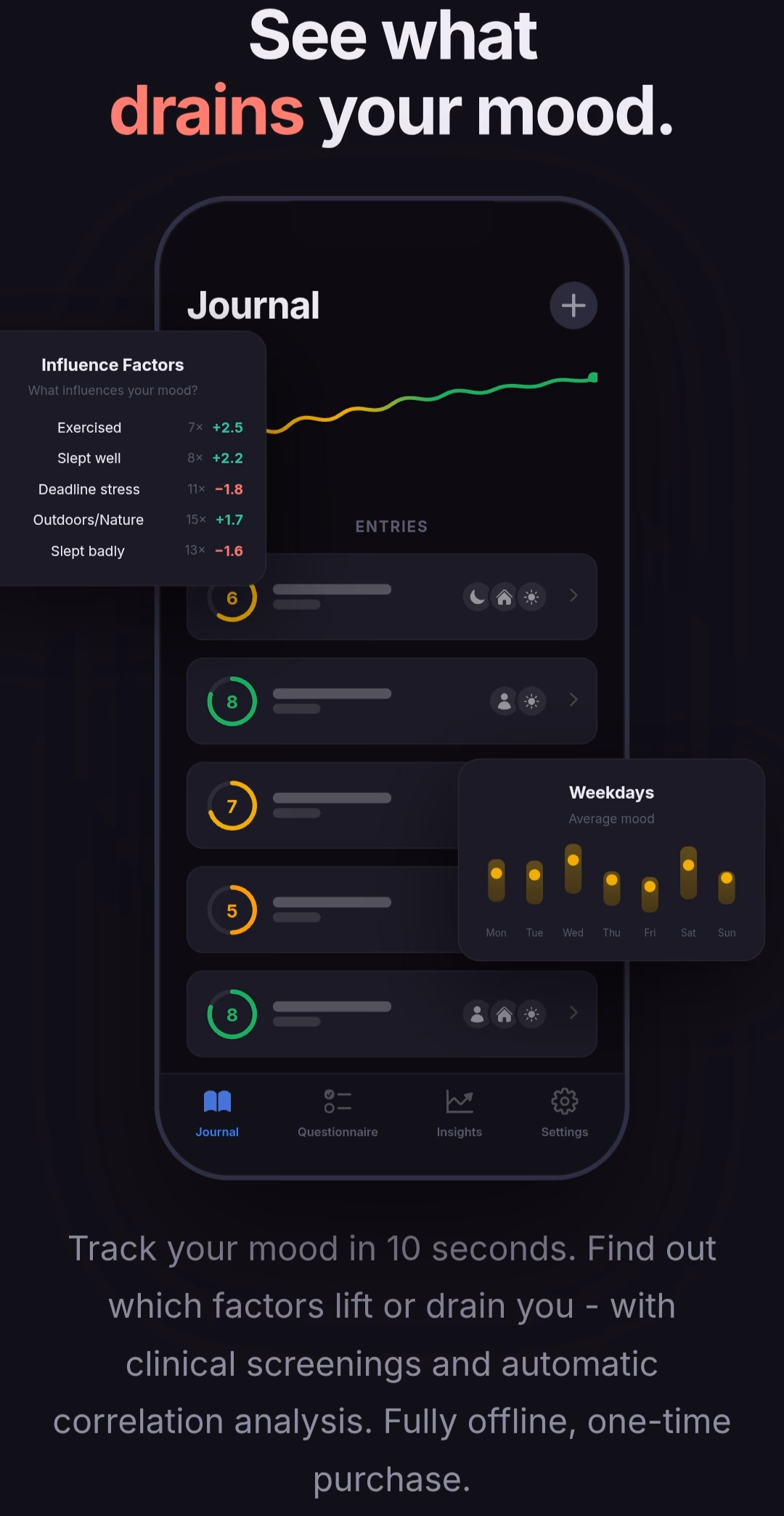 Click to view full sizeTrack your mood in 10 seconds. Find out which factors lift or drain you - with clinical screenings and automatic correlation analysis. Fully offline, one-time purchase. Made in Germany · Offline-first · GDPR compliant