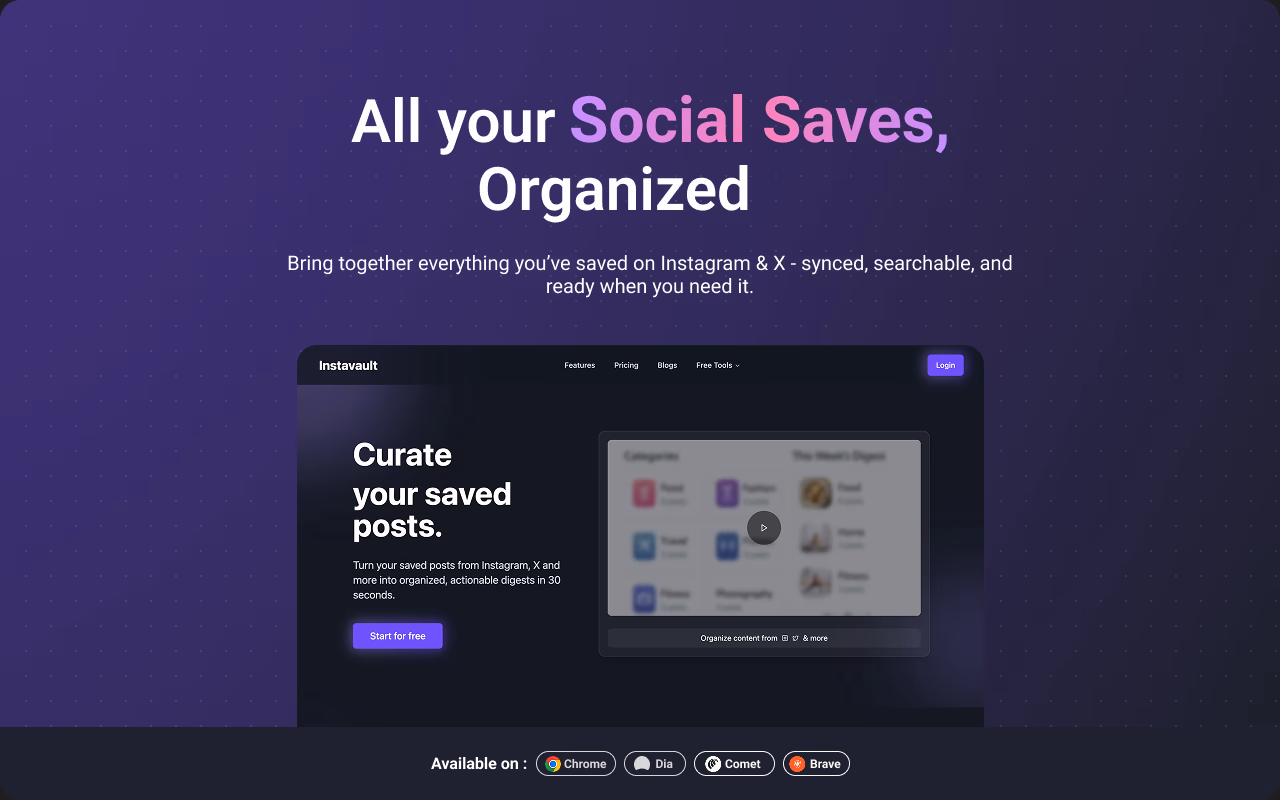 Click to view full sizeInstavault is a digital platform designed to help users organize and manage their social media saved posts effectively. It transforms saved content from various social media platforms into organized, actionable digests. Key features include AI-driven categorization of bookmarks, cross-platform search capabilities, and weekly digests that summarize valuable saves. The tool caters to a diverse range of users including content creators, marketers, and knowledge workers, assisting them in organizing reference materials, tracking campaigns, and managing knowledge resources. Instavault allows exporting bookmarks to spreadsheets for detailed analysis and offers seamless integration across different platforms. Emphasizing privacy and independence, it is not affiliated with major social media companies. Users can start for free and gain insights effortlessly with advanced AI features.