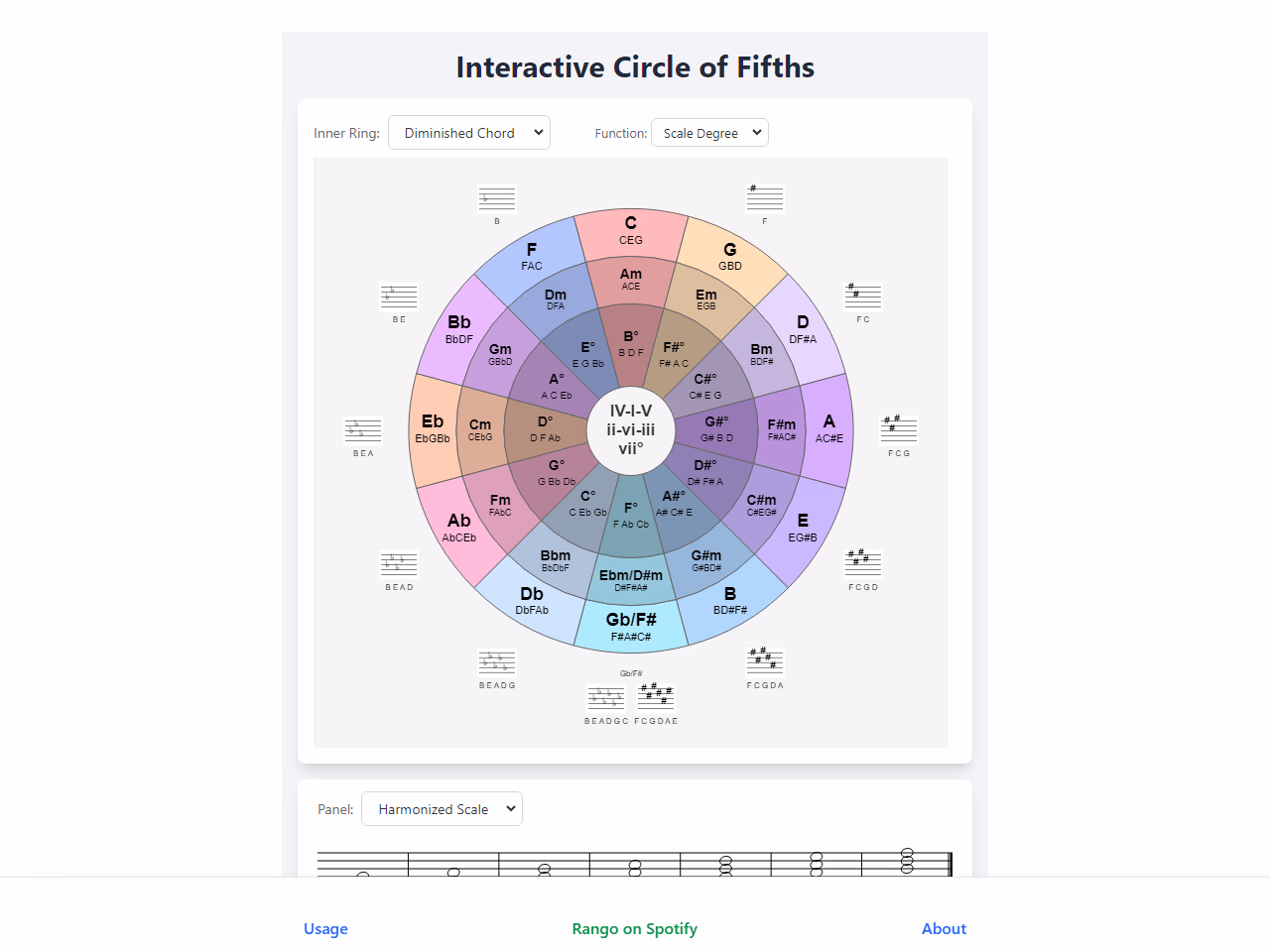 Interactive circle to see/hear chords, scales, and loop progressions.