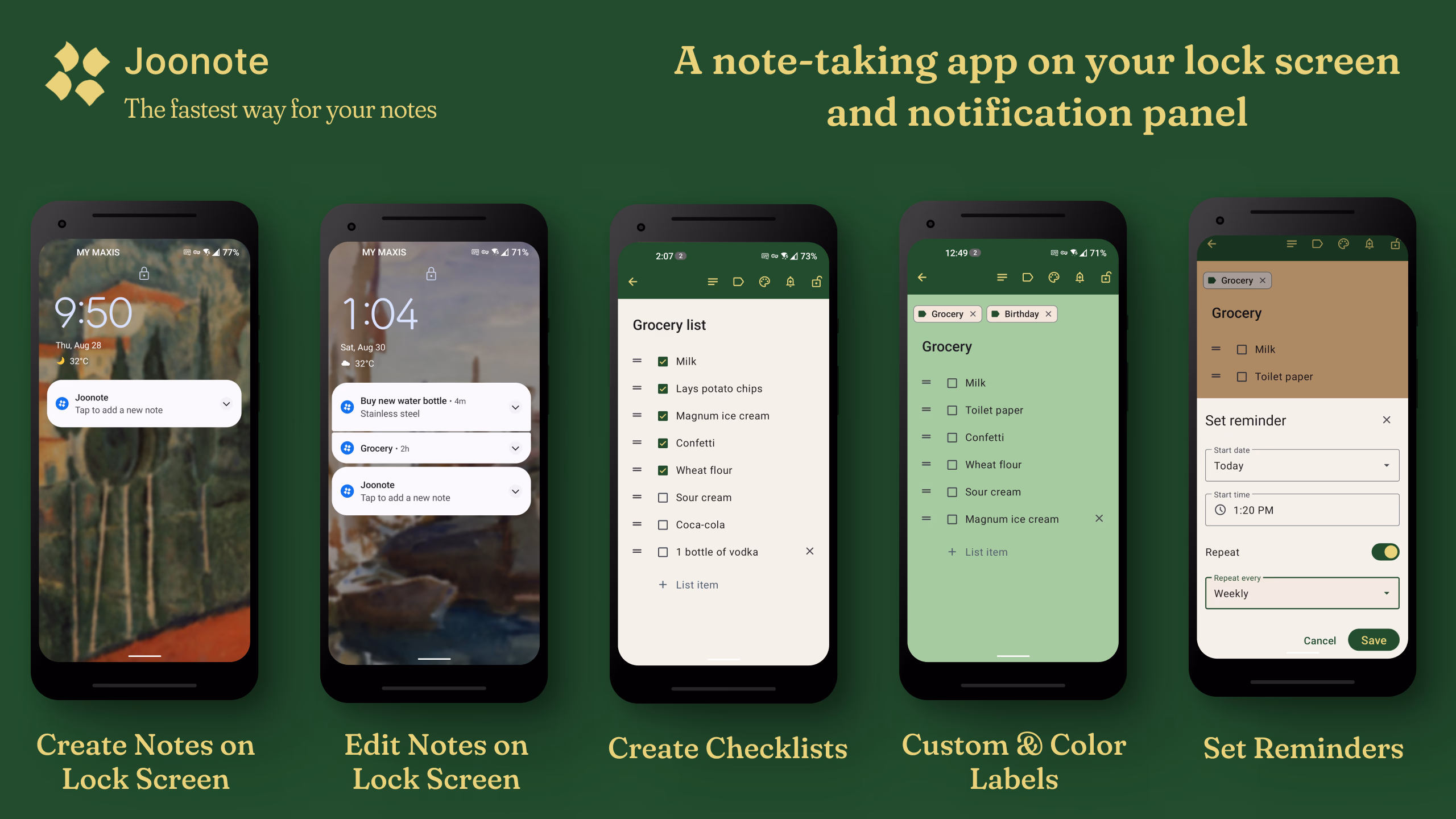 Click to view full sizeJoonote is an Android application designed to enhance note-taking efficiency by allowing users to access and manage notes, to-do lists, and reminders directly from the lock screen and notification panel. This innovative approach eliminates the need to unlock the screen and open an app, ensuring a smooth workflow. Key features of Joonote include the ability to add, view, edit, and delete notes without unlocking the device, creating private notes, setting reminders for specific dates or recurring events, and organizing notes with customizable, colorful labels. Additionally, users can benefit from a widget for quick access, dark mode for reduced eye strain, and secure offline access with auto-backup to Google Drive. These features contribute to a streamlined, user-centric experience, perfect for staying organized on the go.