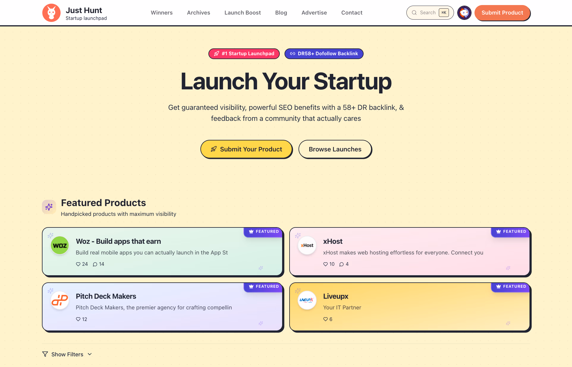 Click to view full sizeJust Hunt is a startup launchpad focused on helping indie hackers and solo founders launch and discover new tech products. The site centers on submitting SaaS, tools, and other products so they can be listed, found by visitors, and potentially featured for higher visibility. It emphasizes benefits such as community feedback and SEO-related exposure, alongside browsing features like product categories, alternatives, trending and top-upvoted lists, and archives of winners and past launches. Just Hunt also publishes supporting resources, including a launch guide and other startup resources, and offers a weekly newsletter with curated product launches and startup insights. The platform includes navigation for boosting launches, badges, and directories-oriented sections.