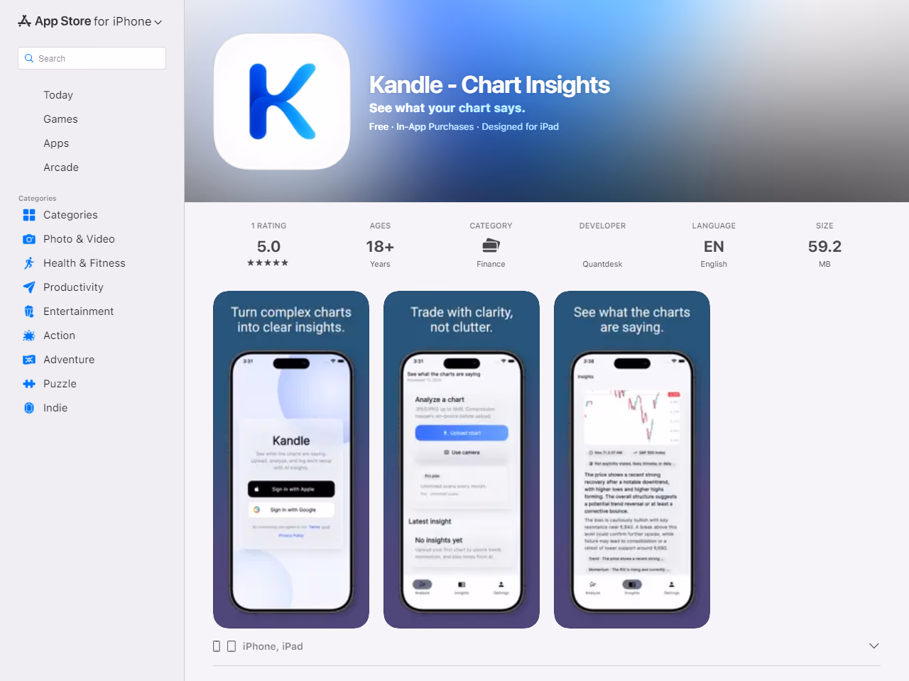 Click to view full sizeKandle - Chart Insights is a finance application developed by Quantdesk, designed to help traders analyze and interpret stock and crypto charts. The app provides instant insights into market structure, trends, and momentum, clarifying complex data into understandable terms. Users can import or capture candlestick charts, allowing Kandle to quickly detect market trends like breakouts, reversals, and consolidations. It features a modern interface focused on clarity, with a comprehensive insights feed and robust privacy protections. Kandle is targeted at swing and intraday traders, as well as professionals seeking accurate data without unnecessary complexity. The app offers a free plan with limited uploads and a Pro plan with unlimited uploads. It's positioned to enhance trading decisions through precise, jargon-free analysis.