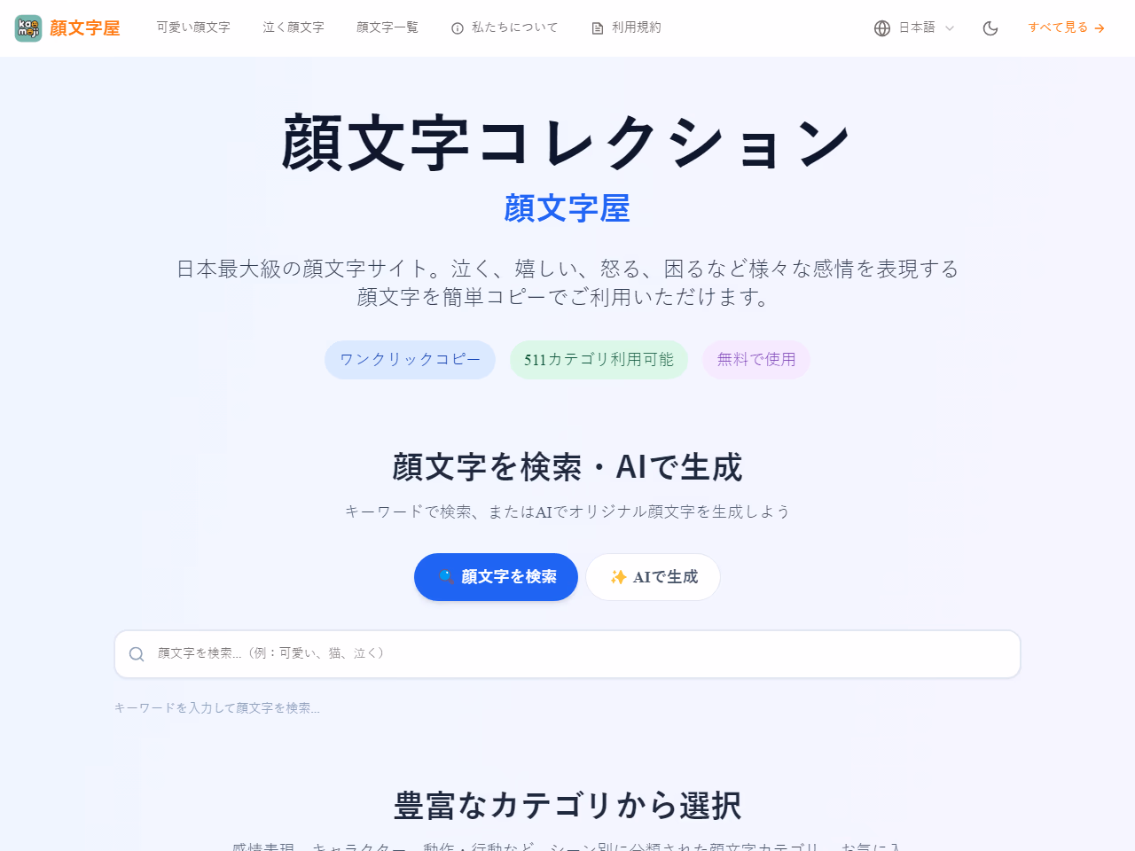 Click to view full size"顔文字屋" is a comprehensive online platform offering over 3000 types of emoticons (顔文字) that users can easily copy and use for free. It's one of Japan's largest emoticon sites, designed to facilitate expressiveness in digital communication by providing a wide variety of facial expressions. The emoticons are categorized by emotions such as happiness, sadness, anger, and surprise, as well as specific actions and characters, making it simple for users to find the perfect expression for any context. The platform supports one-click copying for ease of use and is optimized for both mobile and desktop devices. Users can incorporate these emoticons into their messages across various applications, including LINE, Twitter, and email, to enhance their conversations. Face Emoticons are deeply rooted in Japanese culture, offering a distinctive way to convey subtle emotional nuances through text. The site is accessible without registration and intends to remain free through ad revenue, allowing both personal and commercial use of its emoticons, as long as they are not resold. Regular updates ensure the collection stays fresh and relevant.