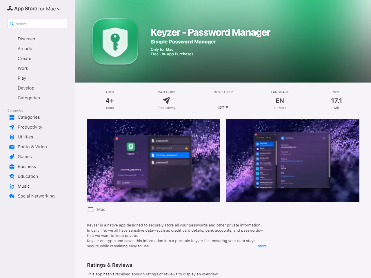 Click to view full sizeKeyzer is a password management app designed to securely store passwords and other sensitive information on Apple devices, such as Mac, iPhone, and iPad. The app encrypts and organizes private data, like credit card numbers and bank account details, into a portable file format, ensuring user data remains secure yet accessible. Keyzer is categorized under productivity and offers in-app purchases for subscription options. It is a native app requiring macOS 14 or later, and supports English and Simplified Chinese languages. The app adheres to privacy principles by not collecting user data. Its development and maintenance are handled by 楚江 王, who also provides support and further information through the developer's website.