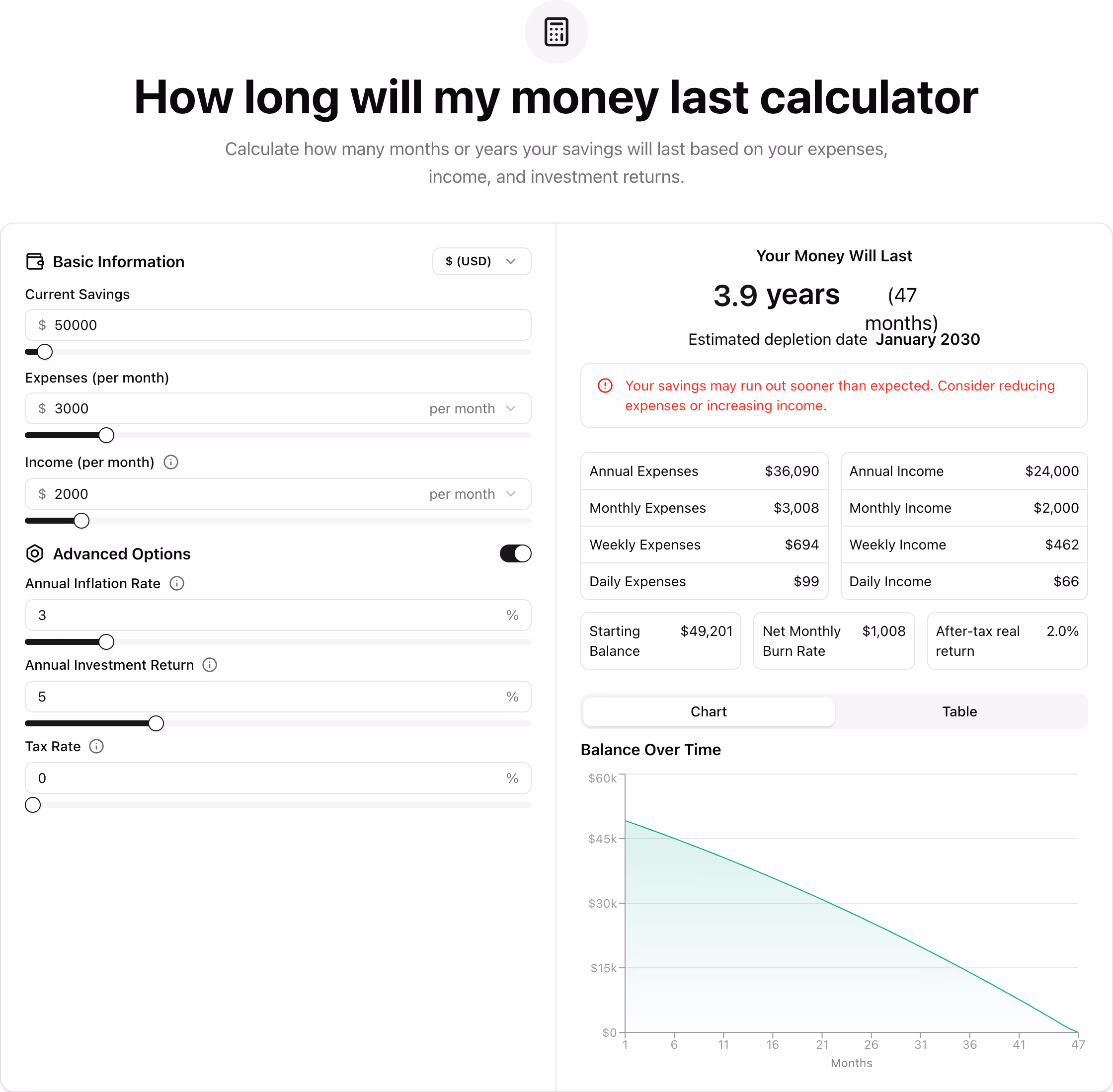 Click to view full sizeThe tool, available on LastCalculator.com, is a "How Long Will My Money Last" calculator designed to help users estimate the longevity of their savings based on current savings, income, and expenses. It allows users to input basic financial details such as current savings, monthly expenses, and income. The tool also offers advanced options to account for annual inflation rates, investment returns, and tax rates. By providing a detailed breakdown, including a visual chart and balance over time, it assists individuals in making informed financial decisions, planning for scenarios like retirement, career breaks, or major purchases. This calculator is also useful for educational purposes, helping users understand budgeting, financial planning, and the impact of inflation and investment on savings.