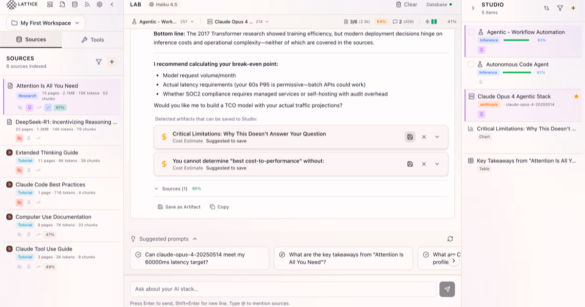 Click to view full sizeLattice is a specialized AI lab assistant designed for research engineers, platform leads, and CTOs to facilitate AI infrastructure decisions. It offers a comprehensive platform that automates the synthesis of research from various sources such as vendor documentation, benchmarks, and pricing data. With its features, users can build curated knowledge bases, generate reusable artifacts, and receive AI recommendations backed by full citations. Lattice provides 34 curated vendor blueprints to help configure AI infrastructure scenarios, ensuring decisions are data-driven and optimized for specific requirements such as latency, compliance, and cost. The tool includes functionalities like a memory calculator, TCO calculator, and model registry, which allow for thorough comparisons and detailed cost analyses. Lattice emphasizes data privacy, utilizing user-provided API keys to maintain control over data usage. Offered with a one-time payment model, it ensures that all future updates are included, providing a comprehensive and continually evolving solution for AI infrastructure planning.