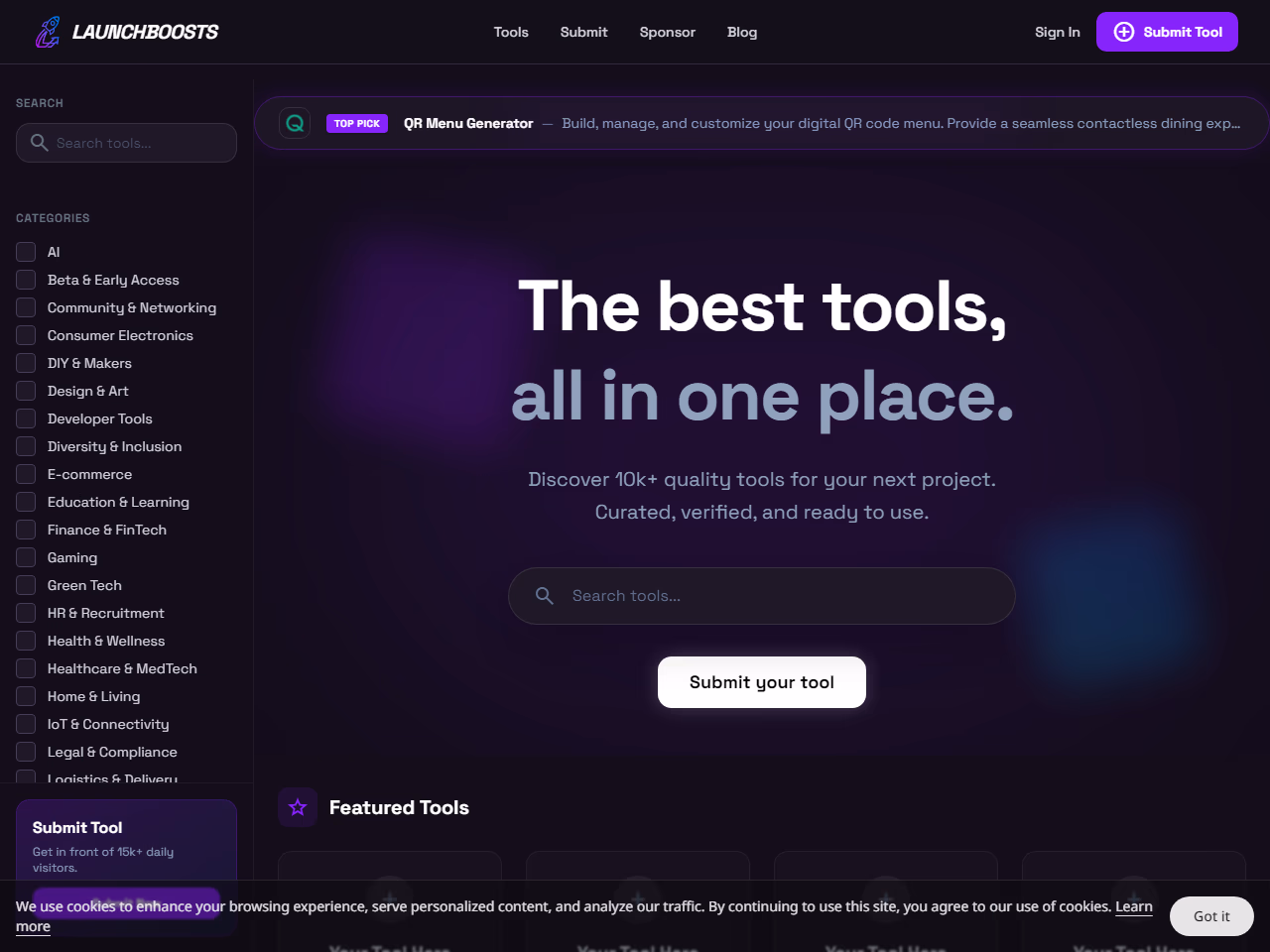 A curated directory to browse AI tools and submit tools to reach daily visitors.