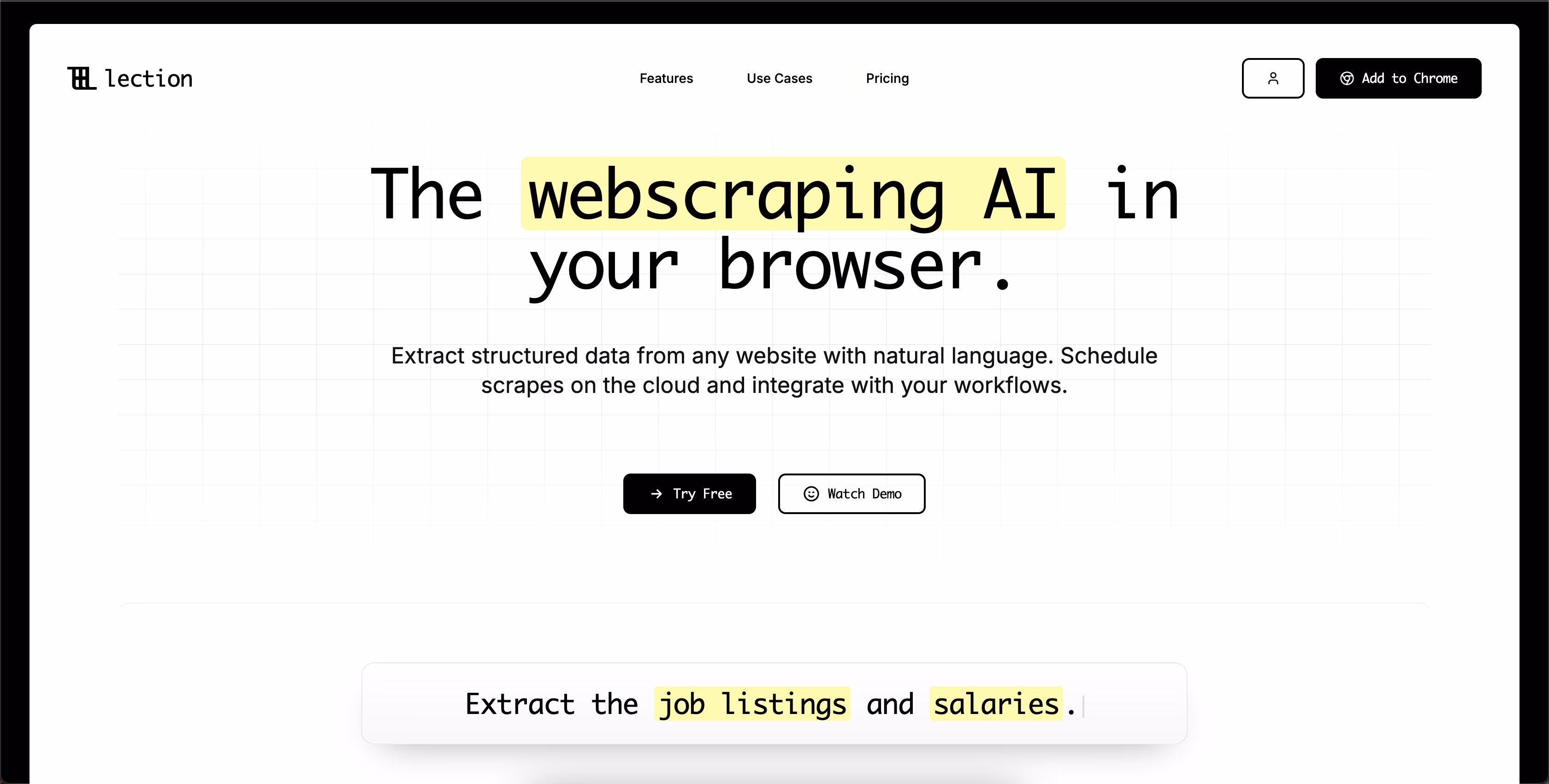 Click to view full sizeLection is a no-code AI web scraping extension designed for use within the Chrome browser. It enables users to effortlessly extract structured data from any website, using natural language commands, without requiring programming expertise. Lection is equipped with features such as cloud-based scraping, prebuilt templates for popular sites, and integration capabilities with tools like Google Sheets and automation platforms such as Zapier. Users can schedule automated scrapes and receive data directly via email while handling complex tasks like pagination and data validation. The tool accommodates various use cases, including competitive intelligence, lead generation, regulatory monitoring, and academic research. By focusing on ease of use and versatility, Lection provides both individuals and teams with the tools to gather actionable insights from web data efficiently.