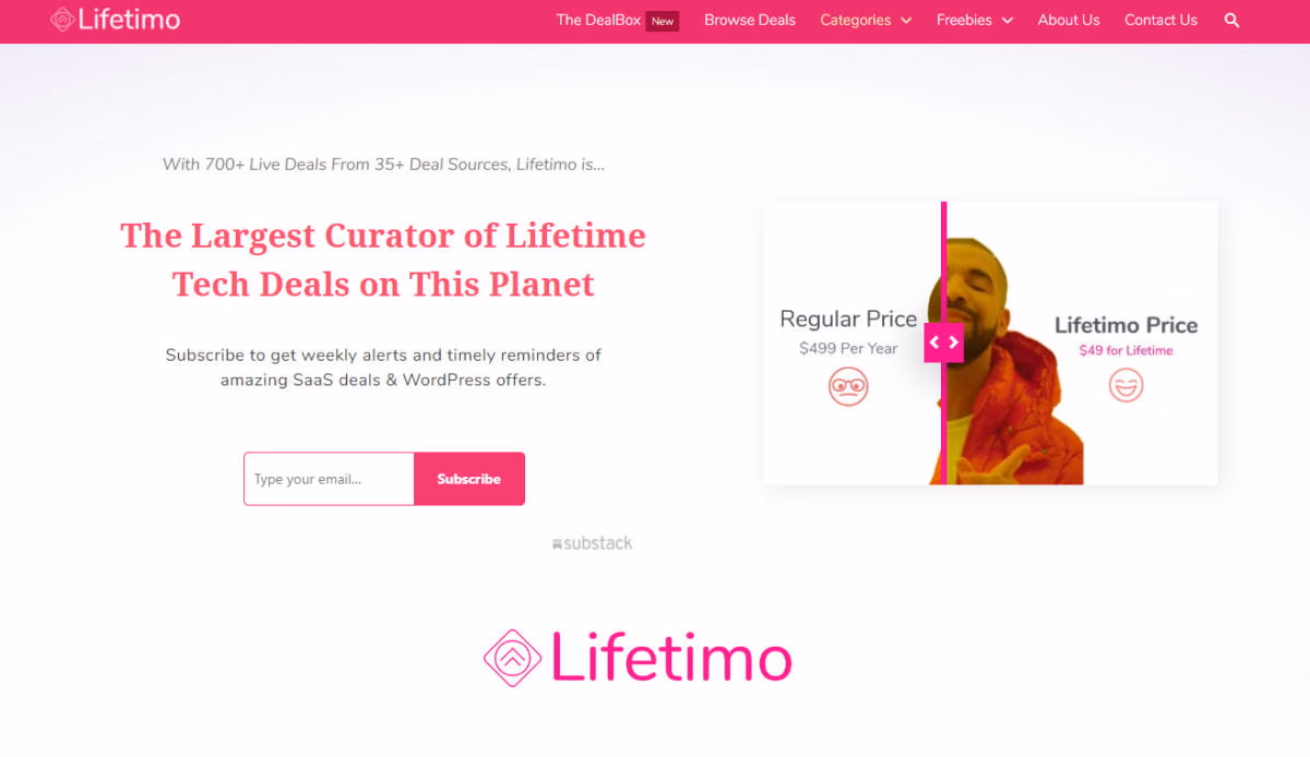 Curates 700+ live lifetime tech deals with search, categories, alerts