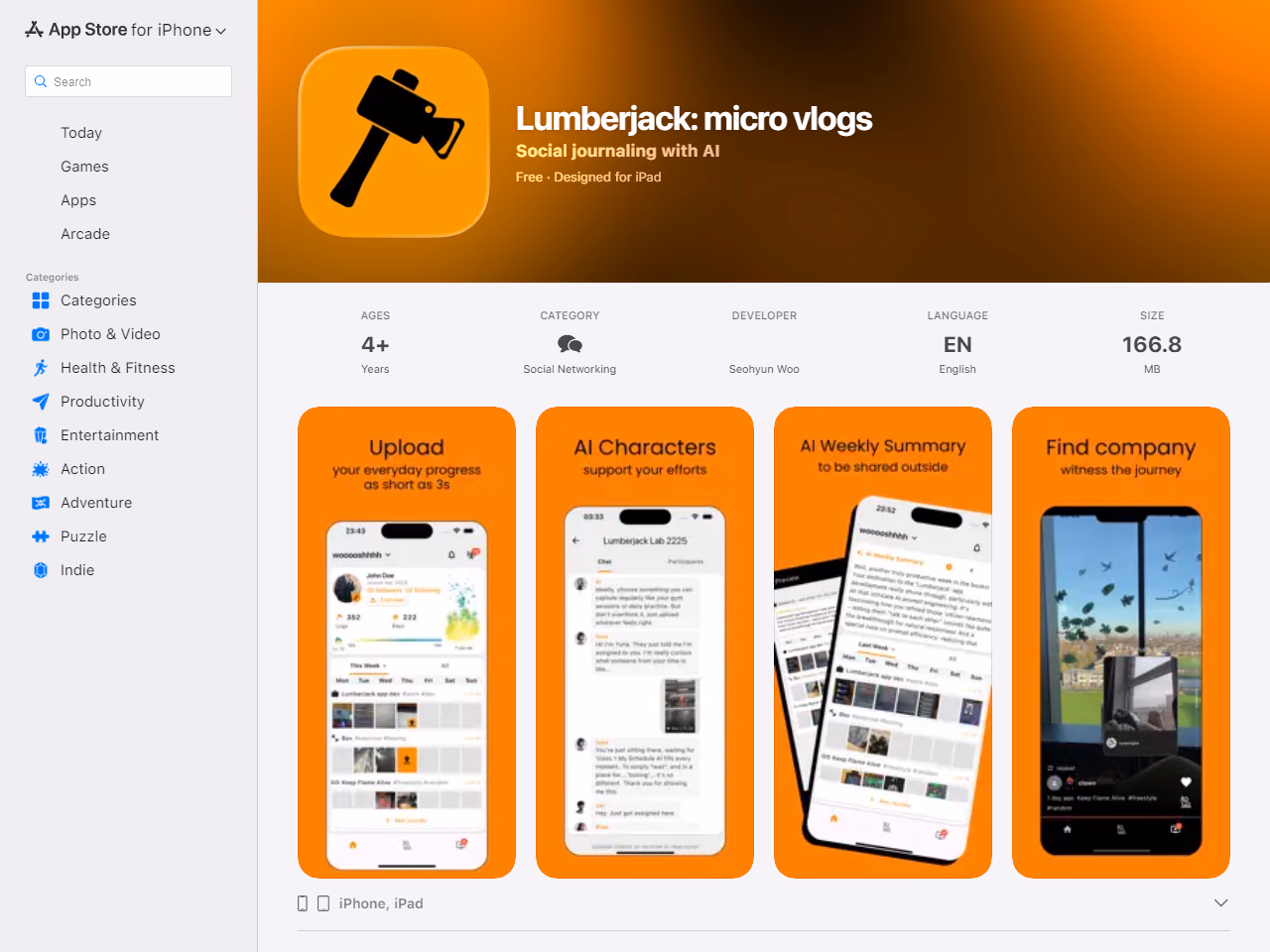 Click to view full sizeLumberjack: micro vlogs is a unique social networking app designed for iOS devices, focusing on social journaling and diary entries through video content. Unlike traditional social media, Lumberjack emphasizes the process over highlights, encouraging users to document their daily journeys in short clips, as quick as two seconds. These entries can cover various aspects of life, such as exercise, creative pursuits, and study routines. The app offers AI-generated reflections and feedback on users' progress, keeping them motivated without the distraction of direct comments or private messages. Users interact with AI 'citizens' from 2226, who are intrigued by genuine human experiences. With features like weekly AI summaries and streak challenges, Lumberjack is tailored for individuals seeking a quiet space to document their real-life efforts away from the polished presentations often seen on social media. It's ideal for those who enjoy consistent personal growth documentation in a supportive and low-pressure environment.