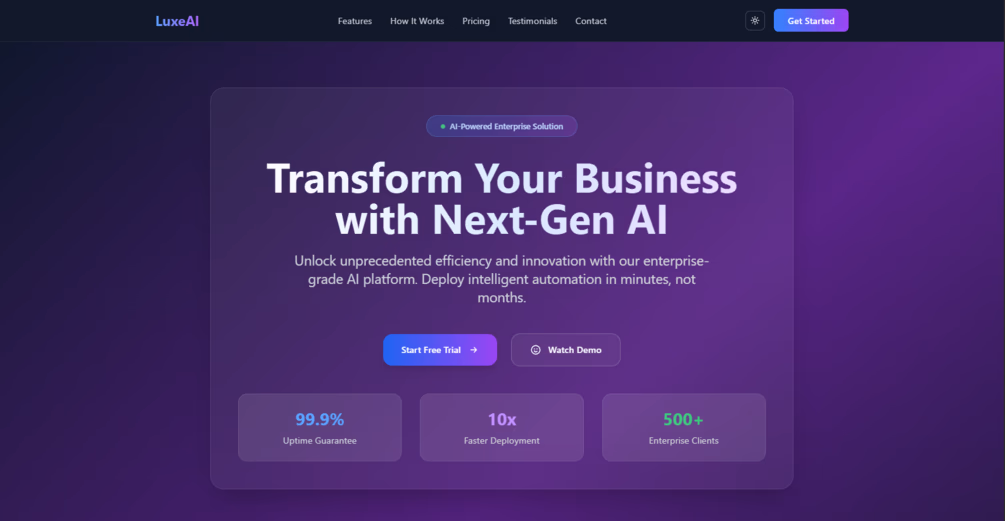 Click to view full sizeThe LuxAI SaaS Landing Page Template is a high-converting, modern HTML template designed to accelerate the launch of AI SaaS products. It caters to startups, indie hackers, and founders looking to build professional and trustworthy online presences quickly. This template emphasizes clear UI/UX design aligned with the expectations of contemporary AI startups, focusing on conversion, trust, and efficiency. Key features include a high-impact hero section, visually appealing feature highlights, a pricing section optimized for SaaS offerings, and testimonials with trust badges to enhance credibility. It is fully responsive, ensuring compatibility across desktops, tablets, and mobile devices. The template's clean, well-structured code is easy to customize and requires no additional frameworks, making it a versatile choice for platforms like Netlify or Vercel. Offered at a special launch price, it aims to address the common pitfall of poor landing pages by providing a robust solution to boost sign-ups and conversions.