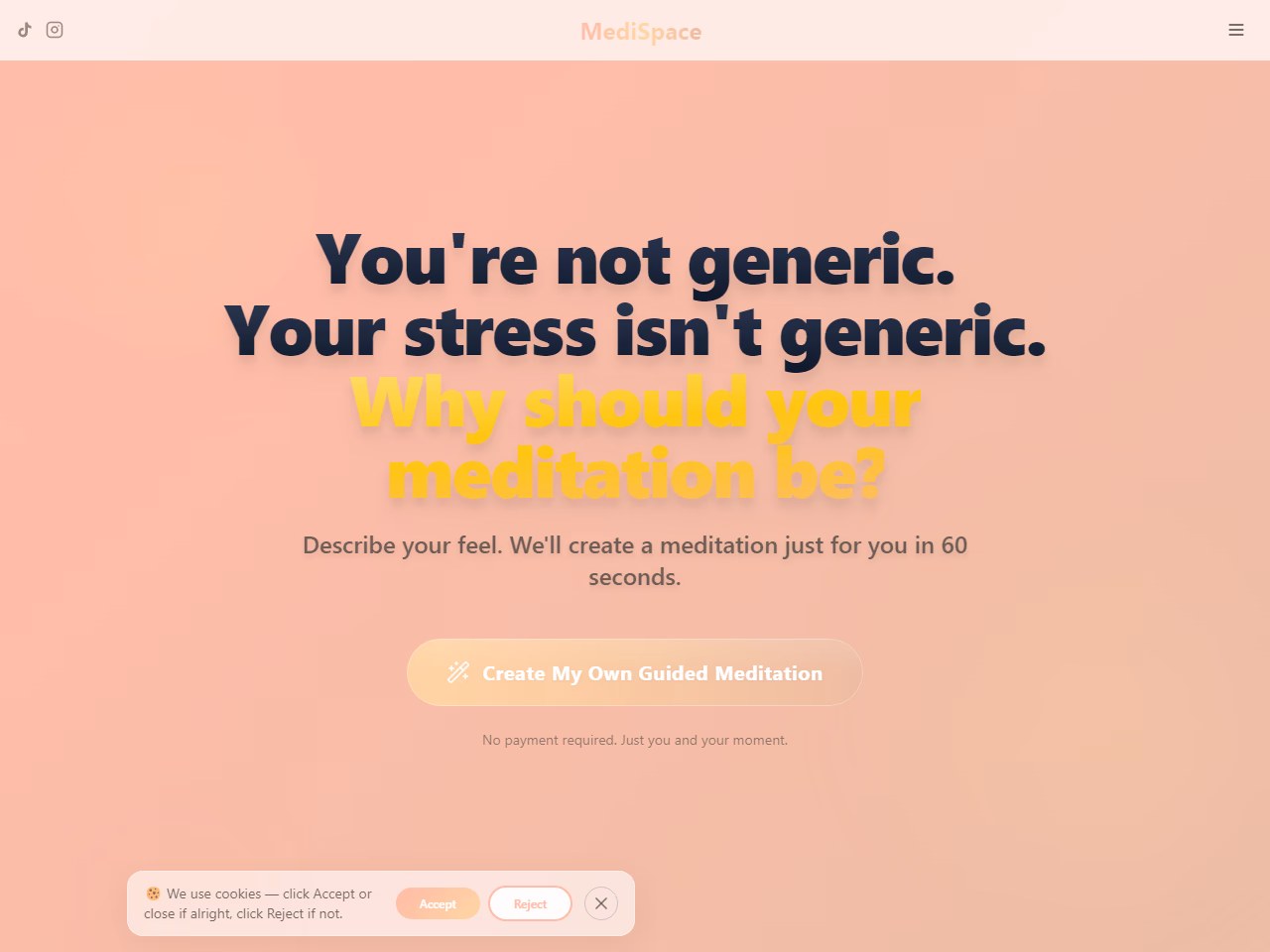 Click to view full sizeMediSpace is an innovative platform focused on personalized meditation experiences. Unlike generic meditation apps, MediSpace tailors sessions specifically to the individual's current emotional state and unique challenges. Users can describe their feelings, and within 60 seconds, receive a guided meditation crafted to address their specific needs, whether it's sleeplessness, work stress, or feelings of being overwhelmed. The service emphasizes quick, targeted sessions, typically around 5 minutes, to effectively relieve stress without demanding significant time commitments. Developed by someone who has personally experienced the shortcomings of traditional meditation tools, MediSpace is designed to provide an immediately responsive and understanding support system. This approach is backed by research indicating that personalized interventions are significantly more effective. No signup or payment is required, making the experience accessible and user-friendly. Overall, MediSpace offers a unique, customizable path to mental wellness, aiming to truly understand and address the users’ personal experiences.