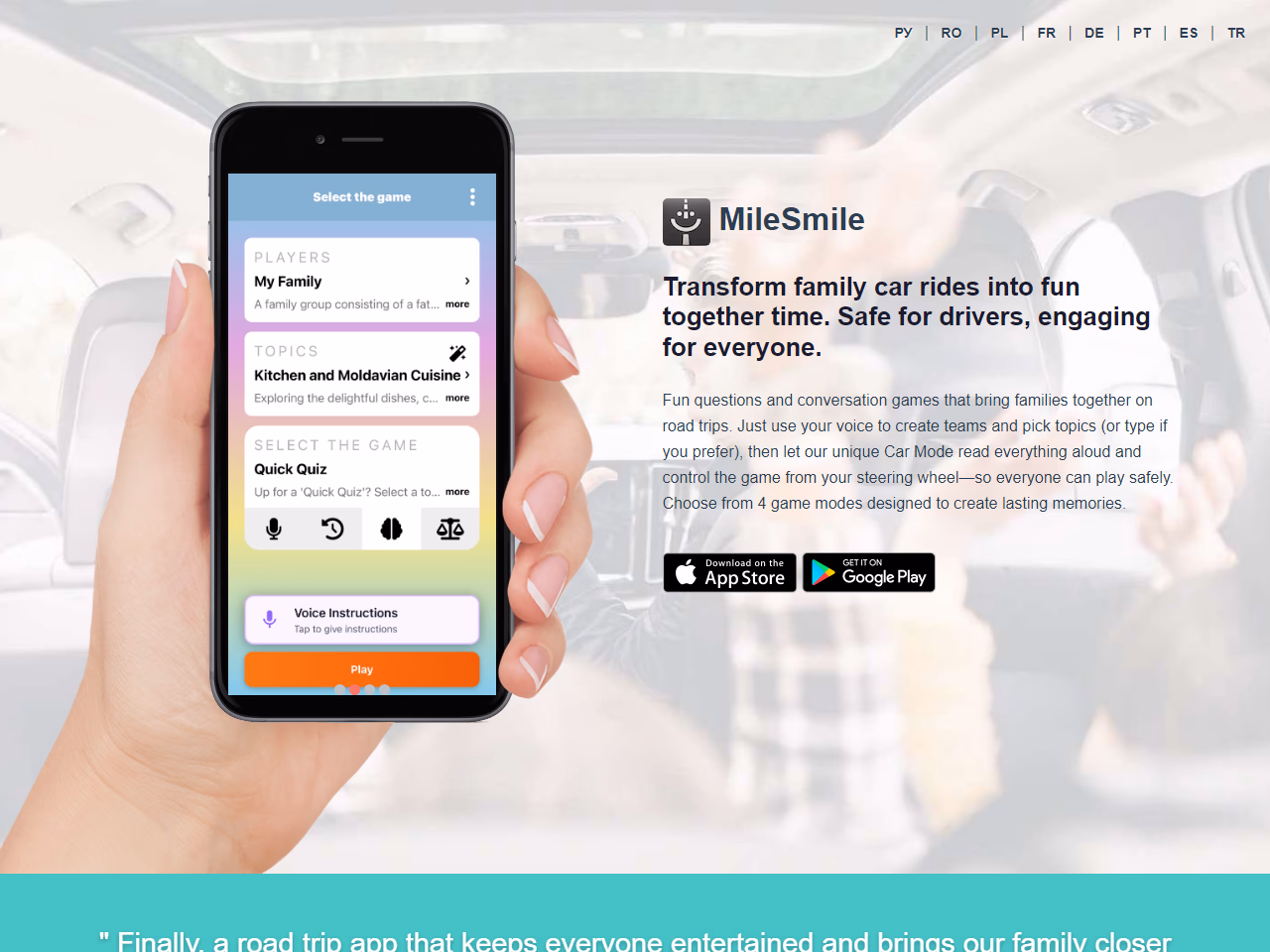 Click to view full sizeMileSmile is an innovative mobile application designed to transform long family car rides into engaging and memorable experiences. The app features a voice-activated, hands-free Car Mode that allows drivers to participate safely in various interactive games without taking their eyes off the road. With four unique game modes—"What Would I Say," "Retrospective," "Quick Quiz," and "Fact or Fiction"—MileSmile offers educational and entertaining activities for families. These games foster connection, enhance critical thinking, and add a fun twist to road trips. The app facilitates bonding through fun trivia, storytelling, and guessing games, making it the ideal companion for road trips or everyday commutes with family. It's designed to make every journey enjoyable and reduce the stress of long travel by replacing the "Are we there yet?" with laughter and learning.