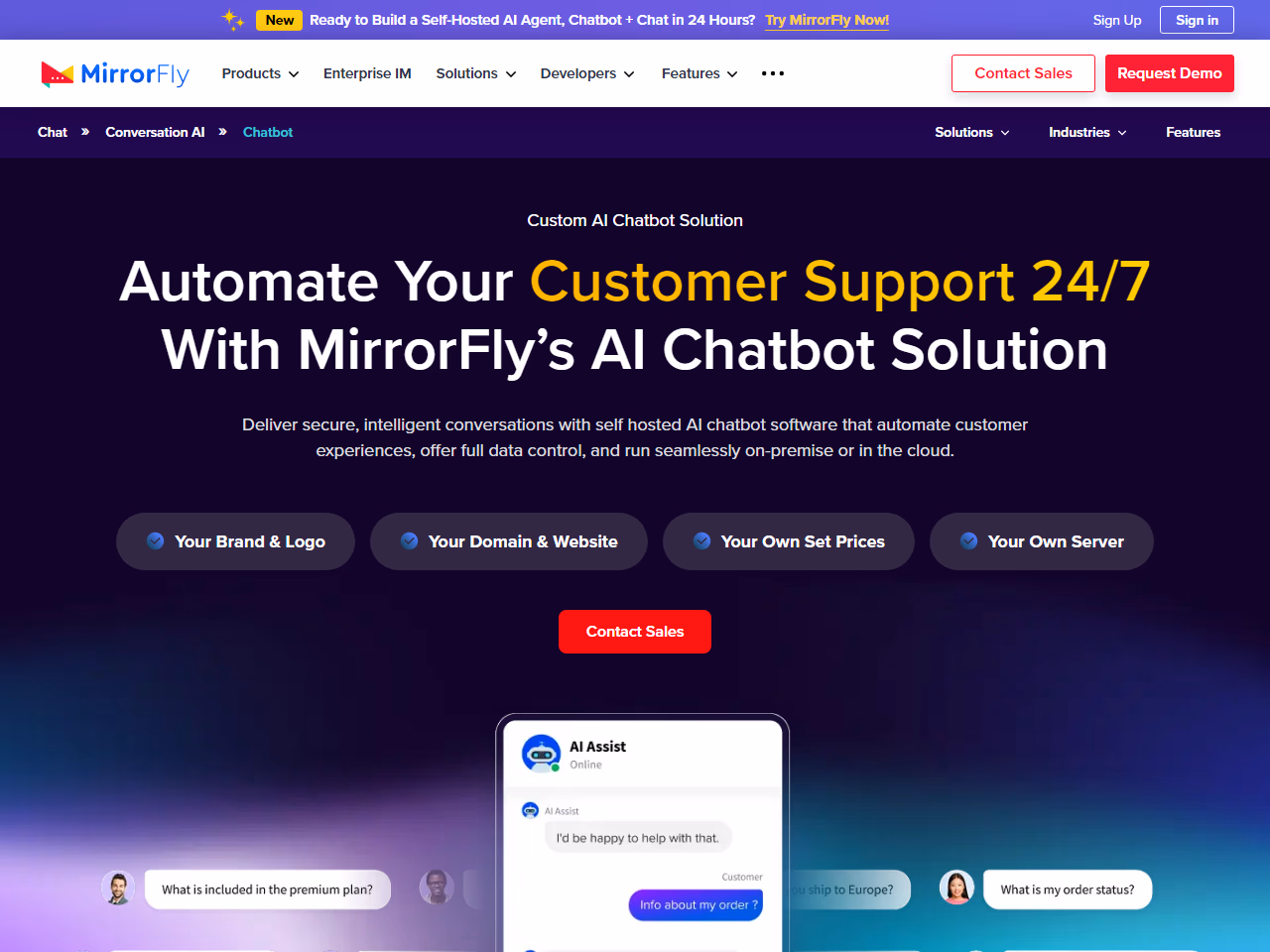 Click to view full sizeMirrorFly is a comprehensive, AI-powered Communications Platform as a Service (CPaaS) offering customizable video, voice, chat, live streaming, SIP/VoIP, and activity feed solutions for both web and mobile applications. The platform enables businesses to build self-hosted AI chatbots and agents capable of automating various tasks, thus enhancing customer interactions across multiple channels. Key offerings include secure, on-premises deployment options, full customization, and white-label services that allow companies to maintain brand integrity while optimizing communication workflows. MirrorFly provides robust solutions for industries such as telecommunication, healthcare, banking, e-commerce, and more, ensuring secure and scalable interactions. With features like real-time chat, multi-channel support, and detailed analytics, businesses can enhance user engagement and operational efficiency while maintaining complete control over data and security. The platform supports extensive third-party integrations, making it a versatile choice for enterprises looking to leverage AI-driven communication tools.