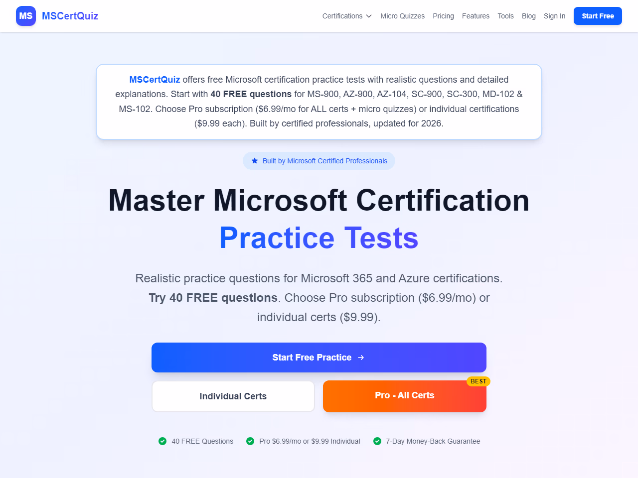 Click to view full sizeMSCertQuiz offers an extensive library of free and subscription-based practice tests for Microsoft certification exams. These include tests for MS-900 (Microsoft 365 Fundamentals), AZ-900 (Azure Fundamentals), AZ-104 (Azure Administrator), SC-900 (Security, Compliance & Identity Fundamentals), MD-102 (Endpoint Administrator), and MS-102 (Microsoft 365 Administrator). Designed by Microsoft certified professionals, these practice tests simulate real exam formats with detailed questions and explanations to help learners prepare effectively. Users can access 40 free questions, with options for a $6.99/month subscription for all certifications or a $9.99 one-time fee per certification. MSCertQuiz provides performance analytics, instant feedback, and detailed explanations, aiming to enhance exam readiness. The platform is mobile-friendly and regularly updated to align with Microsoft’s exam objectives, ensuring relevant and up-to-date preparation tools for IT professionals.